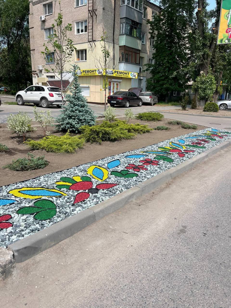 Чарівний миколаївський розпис тепер прикрашає Самару! На вулиці Гідності, 50, розквітла унікальна декоративна інсталяція – яскравий візерунок, виконаний у стилі традиційного миколаївського розпису, викладений з різнокольорового каміння прямо серед соковитої зелені клумби. Цей миколаївський розпис додає колориту міському простору.