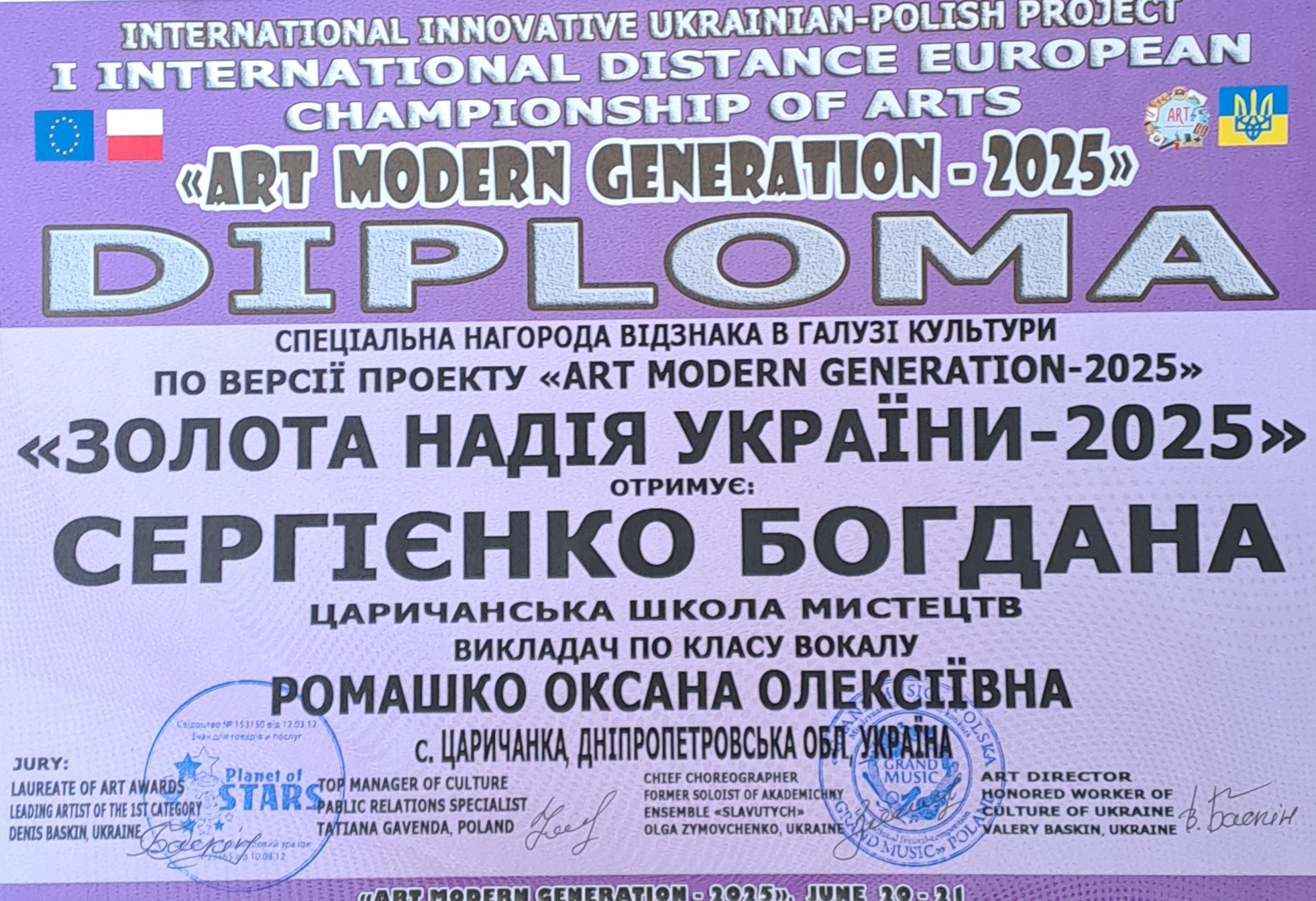 Мистецтво не знає меж, часу і не зупиняється на канікулах. Наші талановиті учні влітку активно демонстрували свої здібності на всеукраїнських мистецьких конкурсах, підтверджуючи високий рівень підготовки та творчий потенціал. Особливо відзначилася Сергієнко Богдана, вихованка вокального класу викладача Ромашко О.О. Вона здобула спеціальну відзнаку в галузі культури за версією проєкту “Art modern Generation-2025”. Її досягнення було відзначено як “ЗОЛОТА НАДІЯ УКРАЇНИ – 2025”. Це визнання є свідченням наполегливої праці учениці та майстерності її наставника. Крім того, викладач Ромашко О.О. також отримала високу відзнаку “Найкращий викладач України – 2025” за версією того ж проєкту. Ця нагорода підкреслює значний внесок викладача у розвиток молодих талантів та виховання мистецької еліти країни. Такі досягнення українських учнів та педагогів на міжнародних та всеукраїнських конкурсах є гордістю для всієї громади і свідченням високого рівня української мистецької освіти. Ми пишаємося нашими юними талантами та їхніми викладачами, які гідно представляють Україну на світовій арені. Продовжуйте розвивати свої таланти та досягати нових вершин у мистецтві!