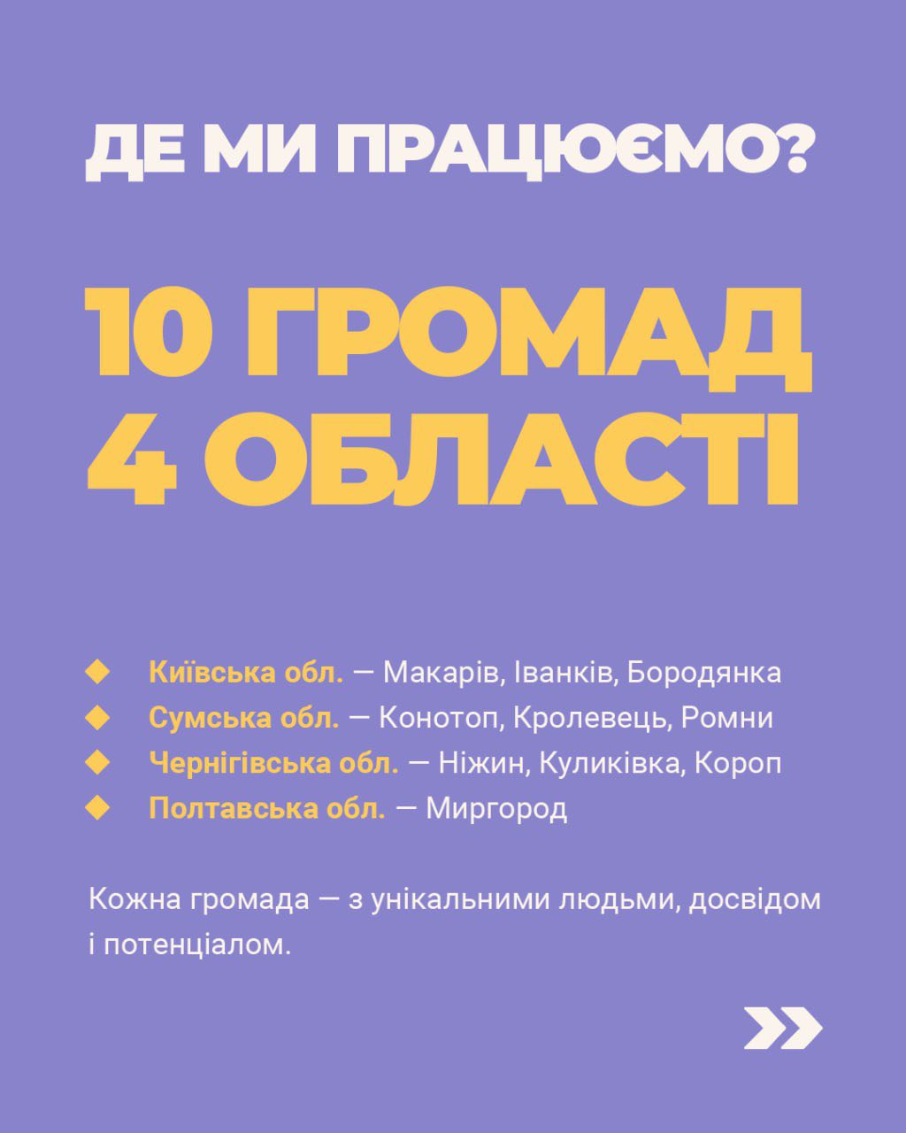 10 громад із 4 областей України вже крокують цим шляхом разом із нами. Кожна — по-своєму сильна, унікальна, відкрита до змін.
