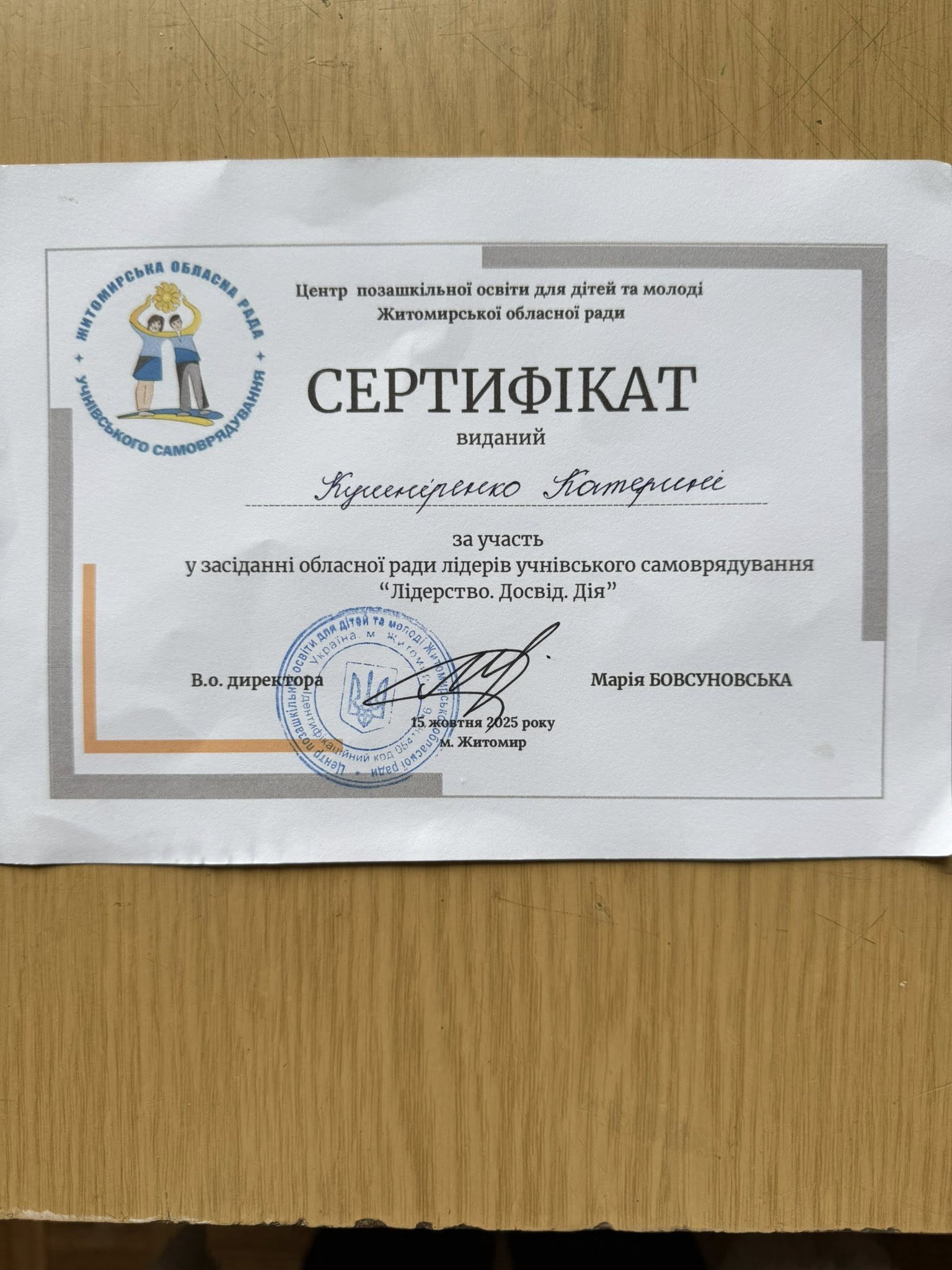 У Центрі позашкільної освіти для дітей та молоді Житомирської обласної ради відбулося важливе засідання обласної ради лідерів учнівського самоврядування Житомирщини. Серед представників громади нашої Черняхівщини були вихованка Центру позашкільної освіти Катерина Кушніренко та методист Центру Віктор Калініченко. Ця подія стала платформою для обміну досвідом та обговорення ключових питань розвитку молодіжного лідерства.