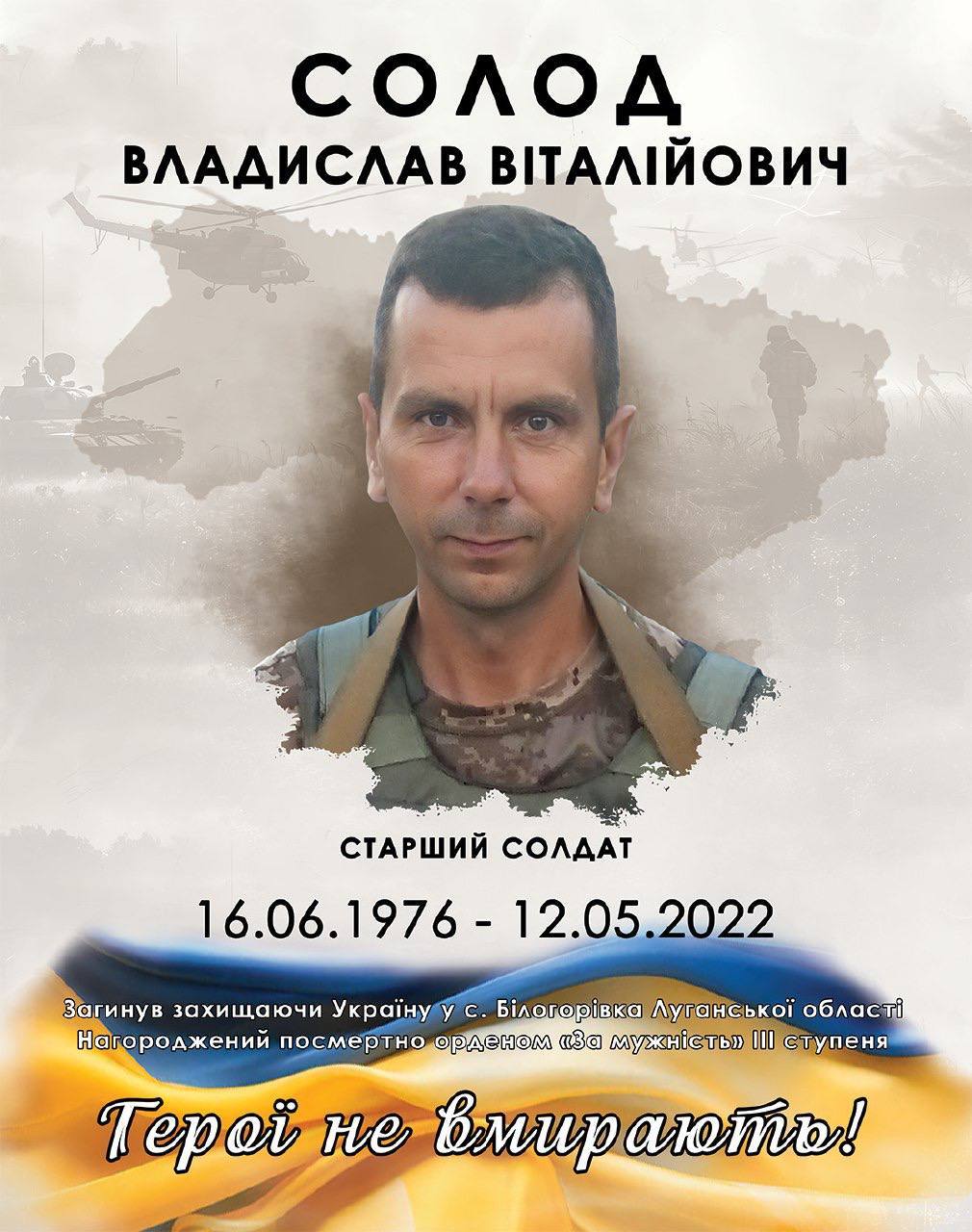 Ми завжди пам’ятаємо наших Героїв. Сьогодні, у третю річницю з дня загибелі Владислава Солода, ми схиляємо голови в скорботі. Владислав Віталійович Солод, старший солдат, відважний навідник мотопіхотного підрозділу, віддав своє життя за Україну 12 травня 2022 року. Він загинув, виконуючи бойове завдання поблизу Білогорівки, що на Луганщині. Наш Герой знайшов вічний спокій у рідному селі Воропаїв.