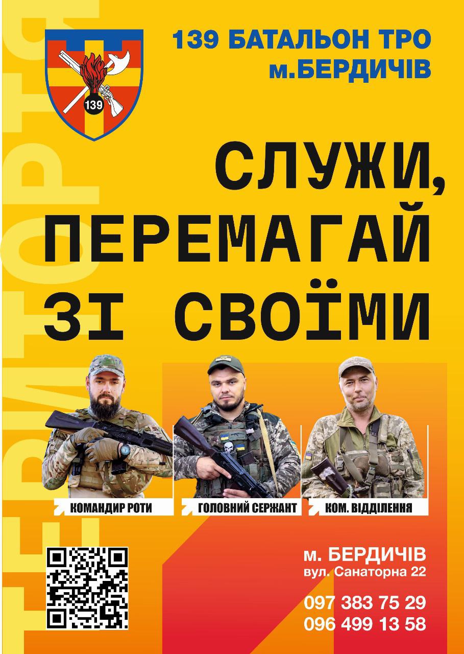 Ми – твої однокласники, колеги, сусіди. Ми – ті, хто понад три роки боронить Україну. Зараз, як ніколи, важливо об’єднатися для захисту нашої землі. Запрошуємо тебе стати плечем до плеча з земляками, щоб разом відстояти своє право на мирне життя. Приєднуйся до лав 139 Бердичівського батальйону ТрО та зроби свій внесок у нашу спільну перемогу. Територіальна оборона Бердичів потребує саме тебе!