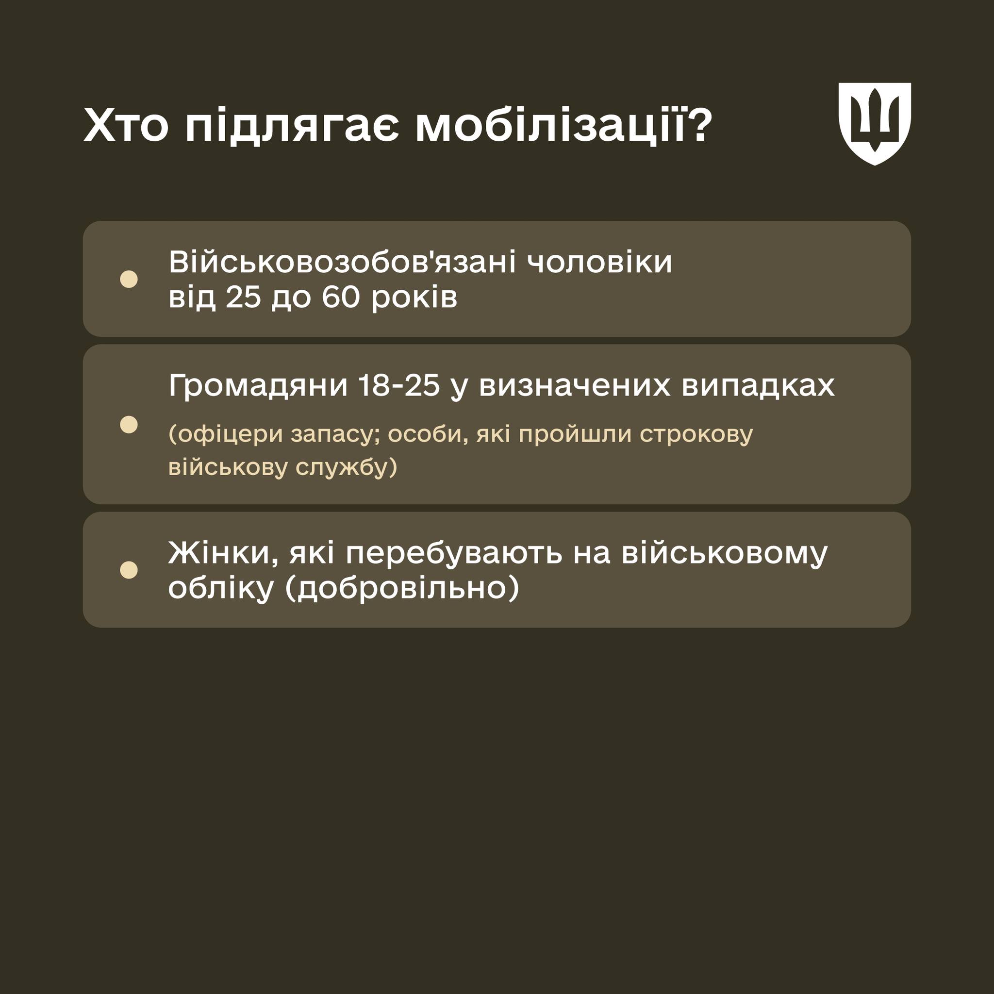 За загальним правилом мобілізації підлягають військовозобов’язані чоловіки від 25 до 60 років, які визнані придатними до військової служби, не мають права на відстрочку і не є заброньованими.