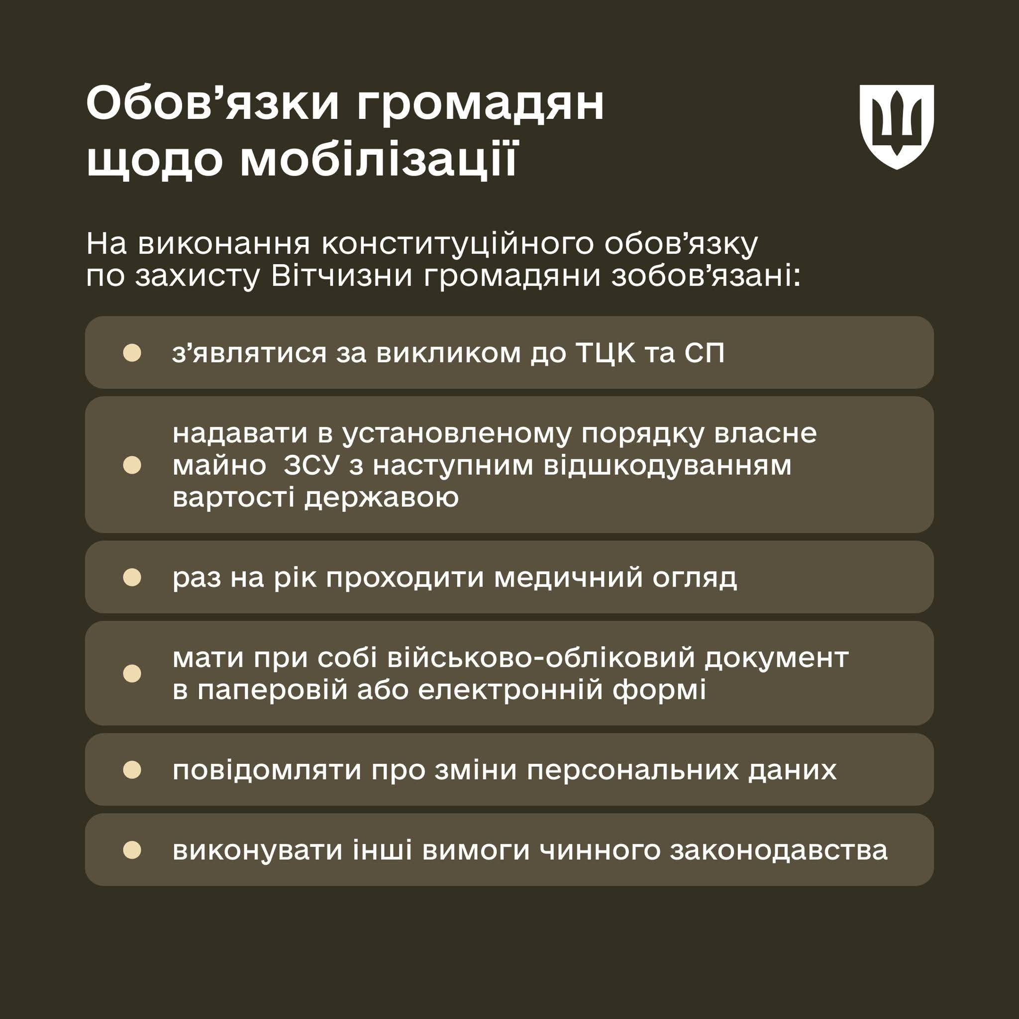 • з’являтися за викликом до ТЦК та СП у строк та місце, зазначені в повістці для взяття на військовий облік, визначення їх призначення на особливий період, направлення для проходження медичного огляду