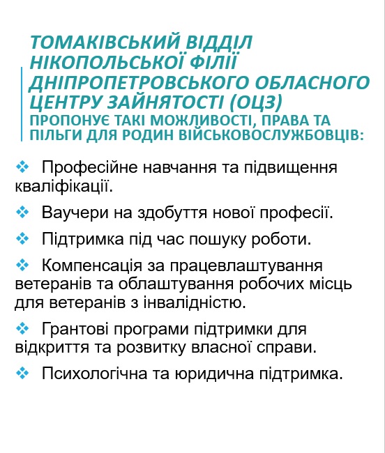 * Ніна Левандовська (начальник Томаківського районного центру зайнятості) — презентувала програми професійного навчання та грантові можливості для родин ветеранів.