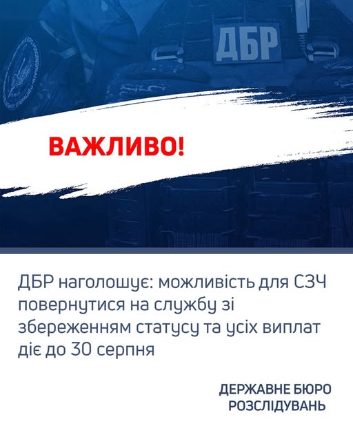 Державне бюро розслідувань наголошує, що термін повернення на службу з поновленням усіх військових виплат для військовослужбовців, які самовільно залишили частину, спливає вже 30 серпня 2025 року. Наразі ще є час для того, аби прийняти правильне рішення, повернутися у стрій і уникнути докорів сумління та проблем із законом.