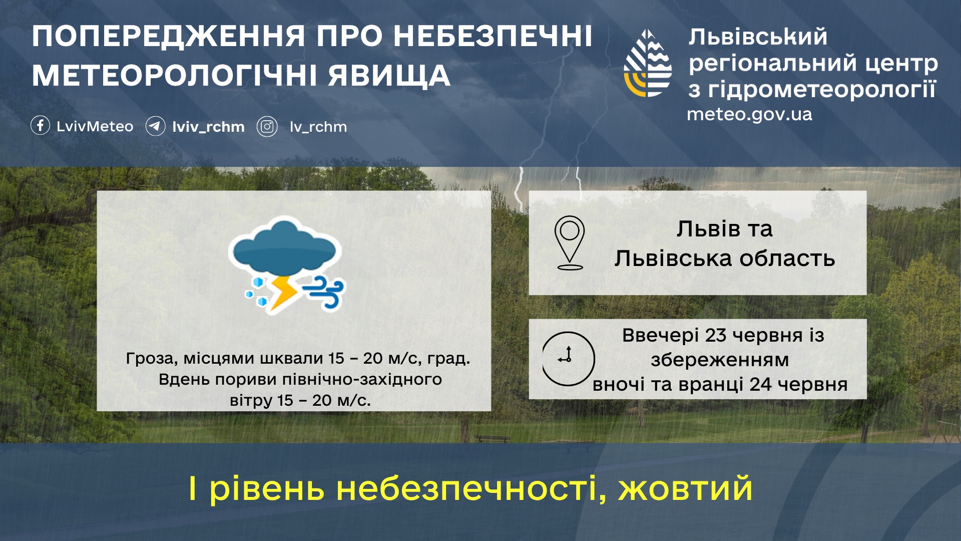 Львівський регіональний центр з гідрометеорології попереджає про можливість небезпечних метеоявищ. Ввечері 23 червня і вночі та вранці 24 червня на території Львівщини прогнозуються грози, місцями шквали, пориви вітру 15 – 20 м/с, град (діаметром 6 – 19 мм), вдень пориви північно-західного вітру 15 – 20 м/с.