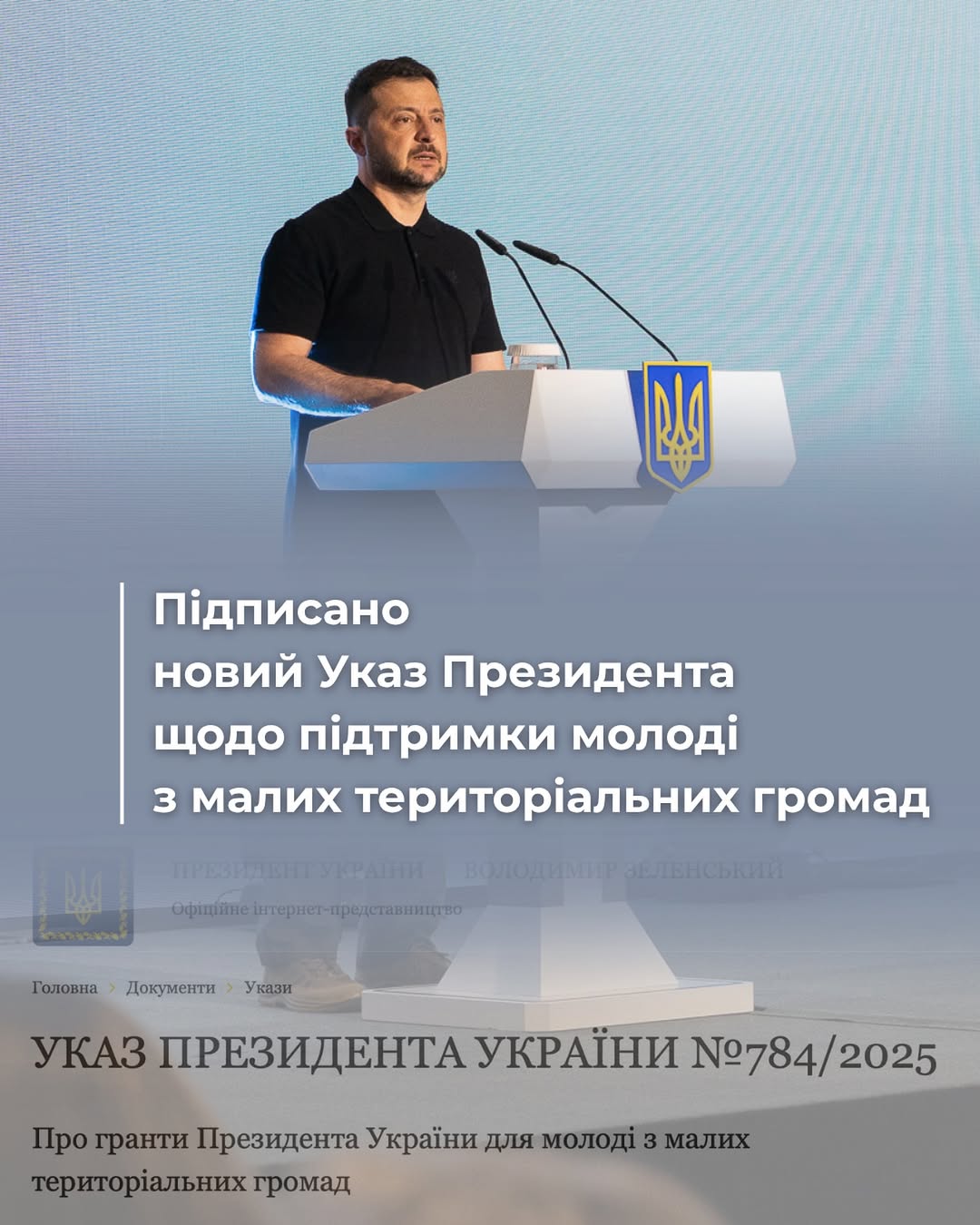 Молодь із громад – у фокусі! Президент України Володимир Зеленський підписав важливий Указ №784/2025 «Про гранти Президента України для молоді з малих територіальних громад». Це значне досягнення, що розширює можливості підтримки для молодих лідерів та активістів, які проживають не лише у великих містах, але й у найменших громадах по всій Україні.
