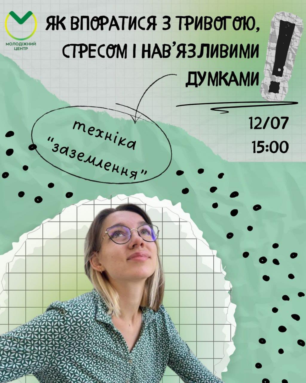 Молодіжний центр запрошує на лекцію-тренінг: “Як впоратися з тривогою, стресом і нав’язливими думками. Техніка «Заземлення»” 🧘♀️🧠💫