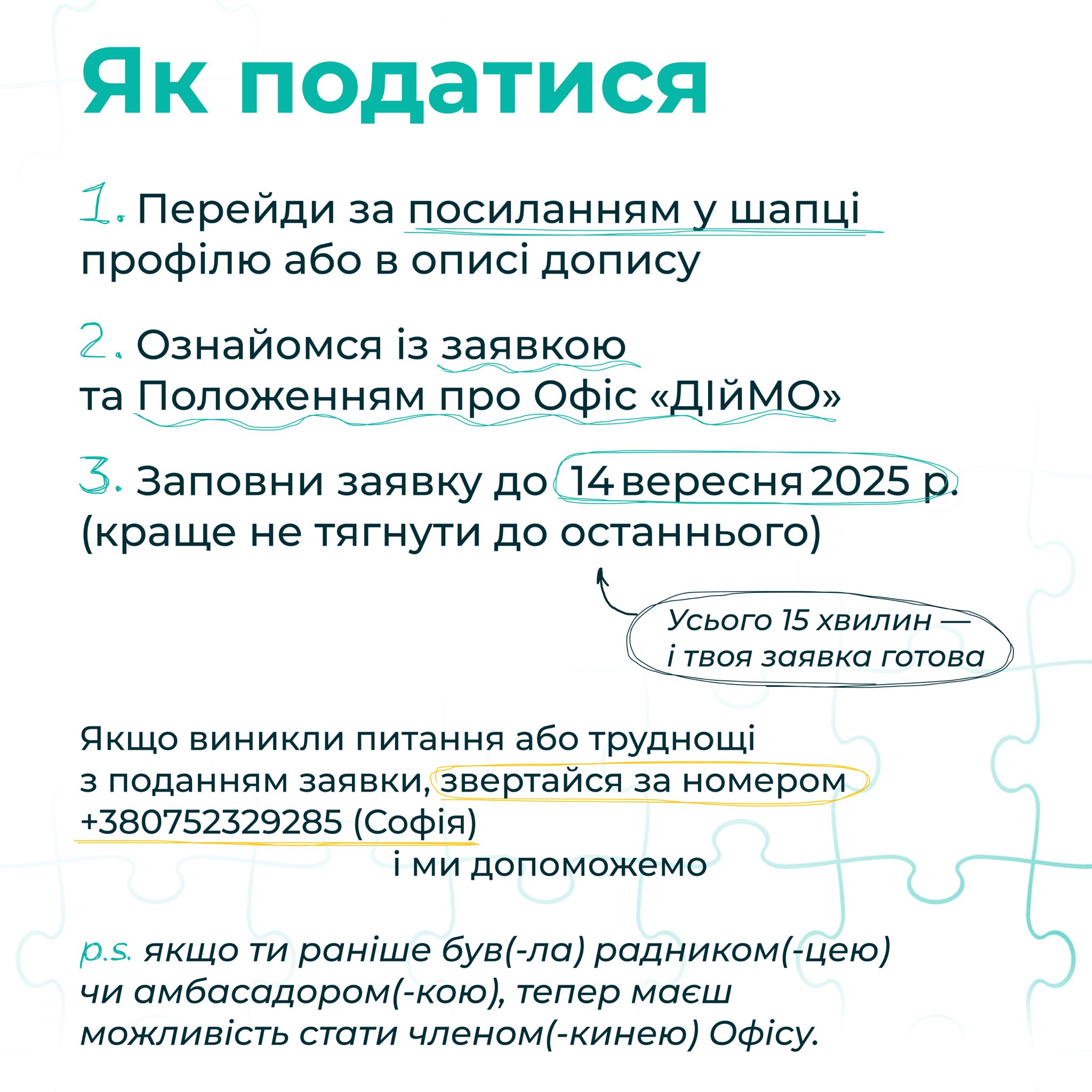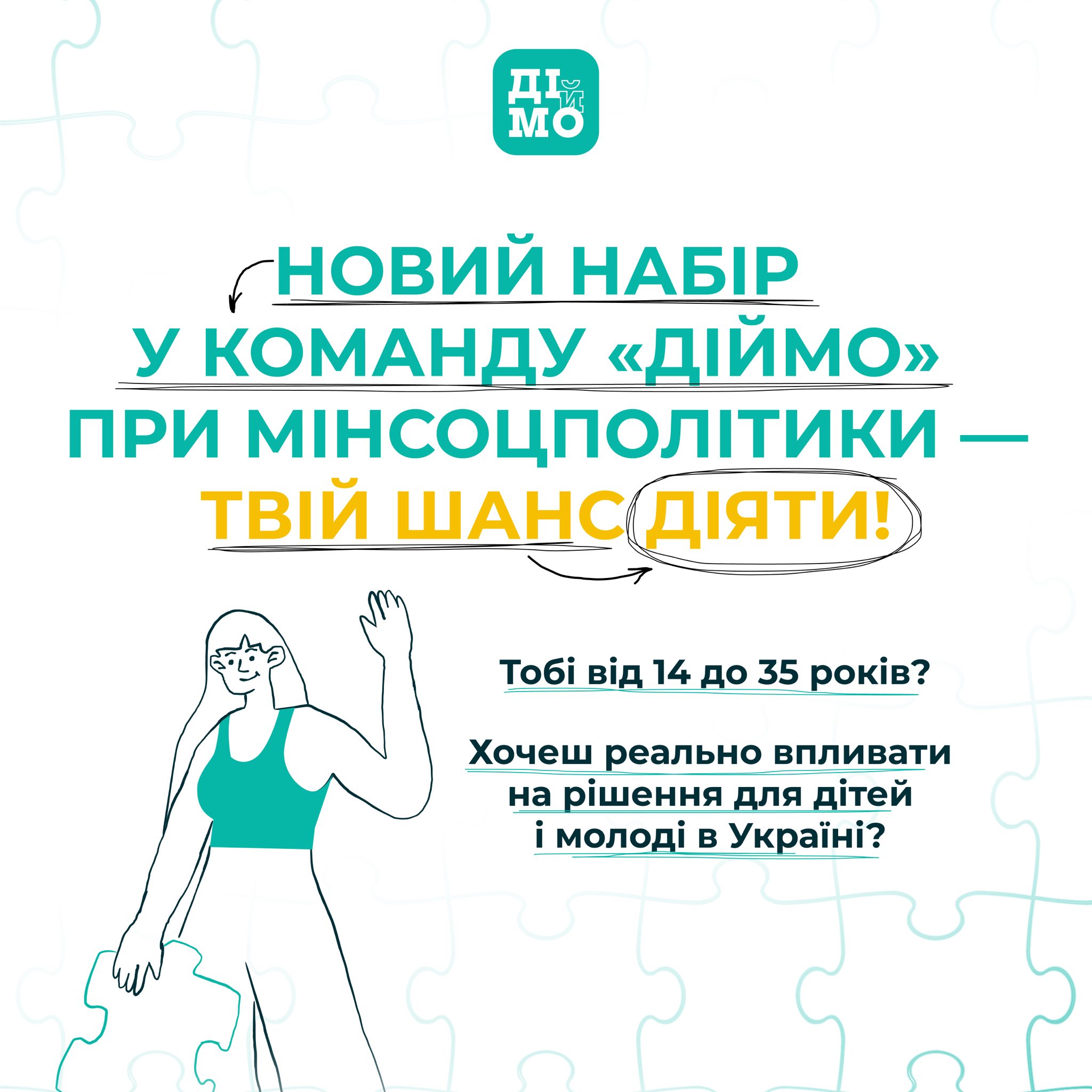 Молодь України віком від 14 до 35 років має унікальну можливість долучитися до роботи Офісу “ДІйМО” – консультативно-дорадчого органу при Міністерстві соціальної політики, сім’ї та єдності. Це чудова нагода стати частиною команди, яка працює над захистом прав та забезпеченням добробуту дітей і молоді, особливо з вразливих груп населення. Якщо ви маєте проактивну позицію та бажання змінювати світ на краще, цей конкурсний відбір саме для вас.