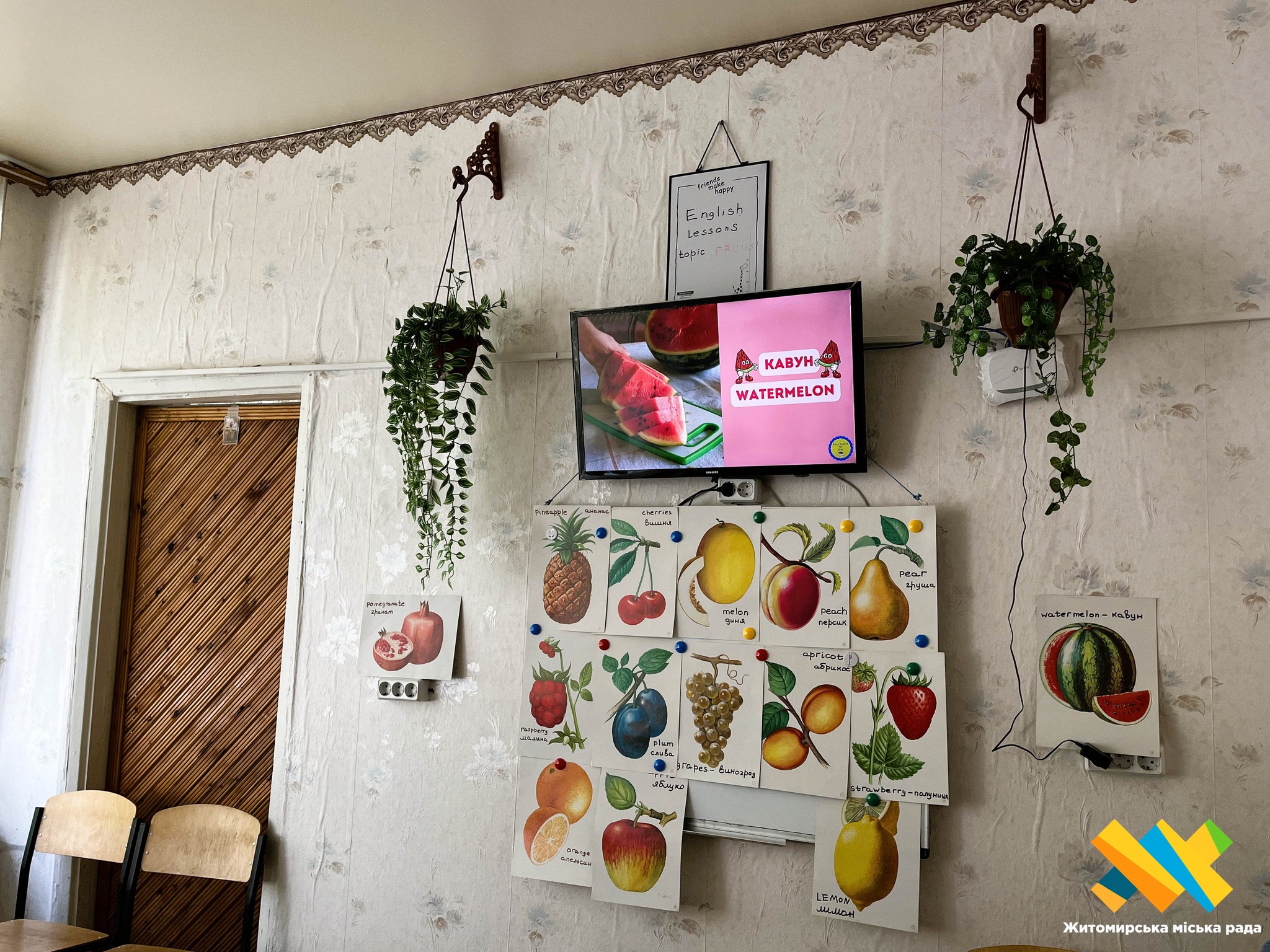 На попередньому занятті вивчали займенники. Сьогодні тема — фрукти. Повільно, з повтореннями й усмішками вони тренують вимову: «apple», «banana», «orange»…