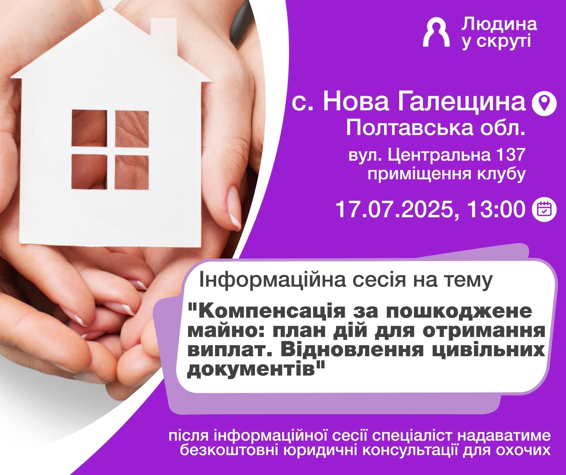Міжнародна гуманітарна організація “Людина у скруті” запрошує жителів Полтавщини на інформаційні сесії: “Компенсація за пошкоджене майно: план дій для отримання виплат. Відновлення цивільних документів”