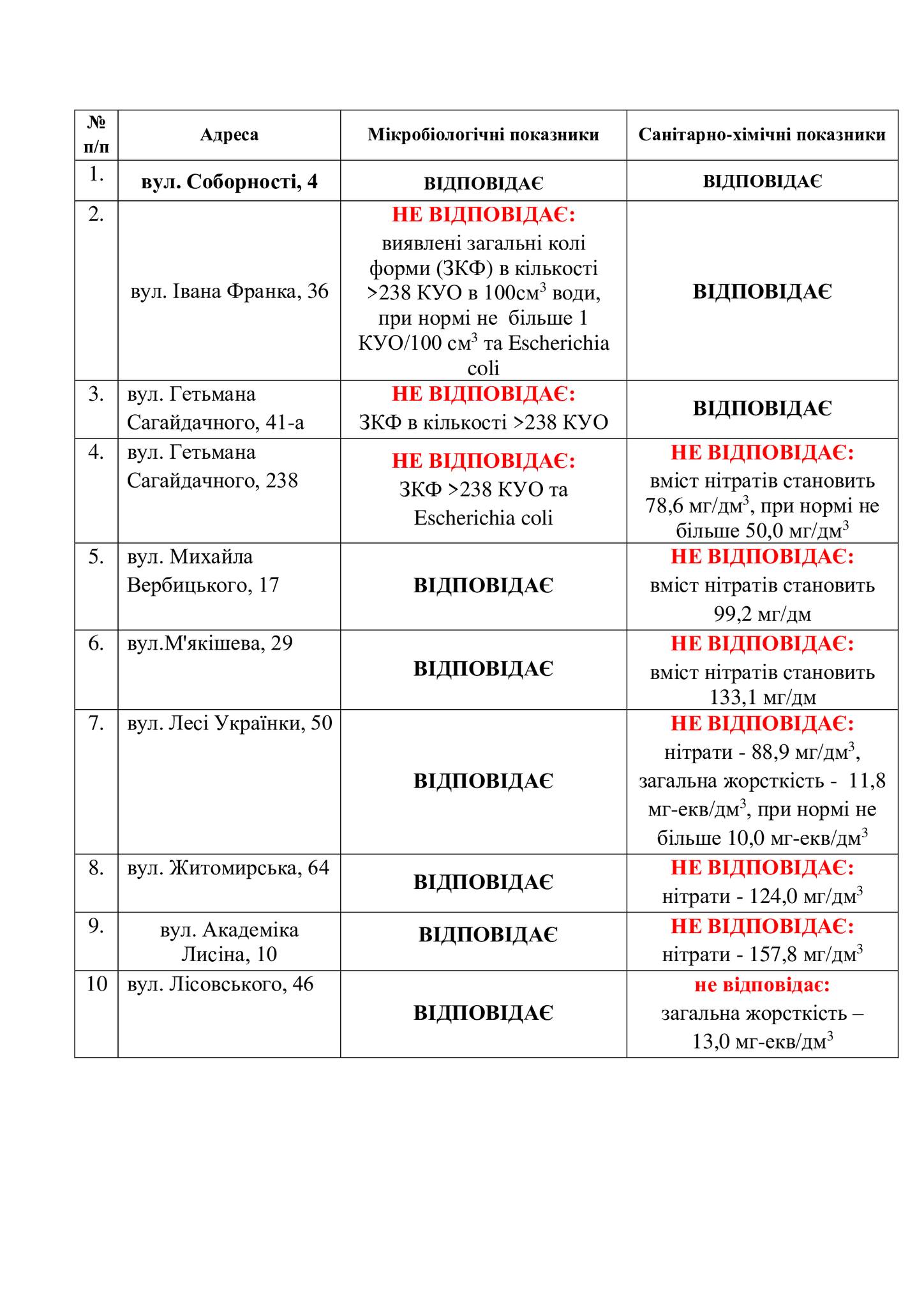 Водночас, у деяких громадських криницях було виявлено відхилення від встановлених норм за мікробіологічними показниками. Це може свідчити про потенційне забруднення води, яке потребує негайного реагування. В осередках, де були виявлені подібні відхилення, будуть проведені необхідні заходи з дезінфекції. Це дозволить усунути виявлені порушення та відновити безпечний стан води для користування мешканцями.