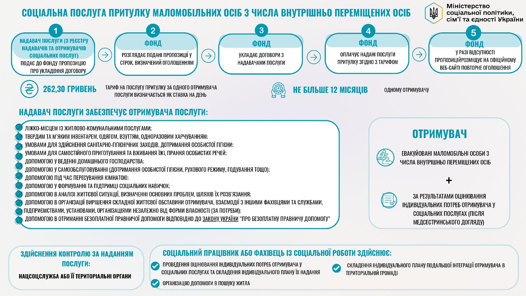 Що стосується послуги притулку, вона розроблена спеціально для маломобільних ВПО. Вона передбачає забезпечення безпечним проживанням, повноцінним харчуванням, сприяння у самообслуговуванні та повсякденних справах. Крім того, послуга спрямована на розвиток соціальних навичок та надання підтримки у подоланні складних життєвих обставин. Організації та фізичні особи-підприємці, які зареєстровані як надавачі соціальних послуг, можуть надавати цю послугу протягом 12 місяців.