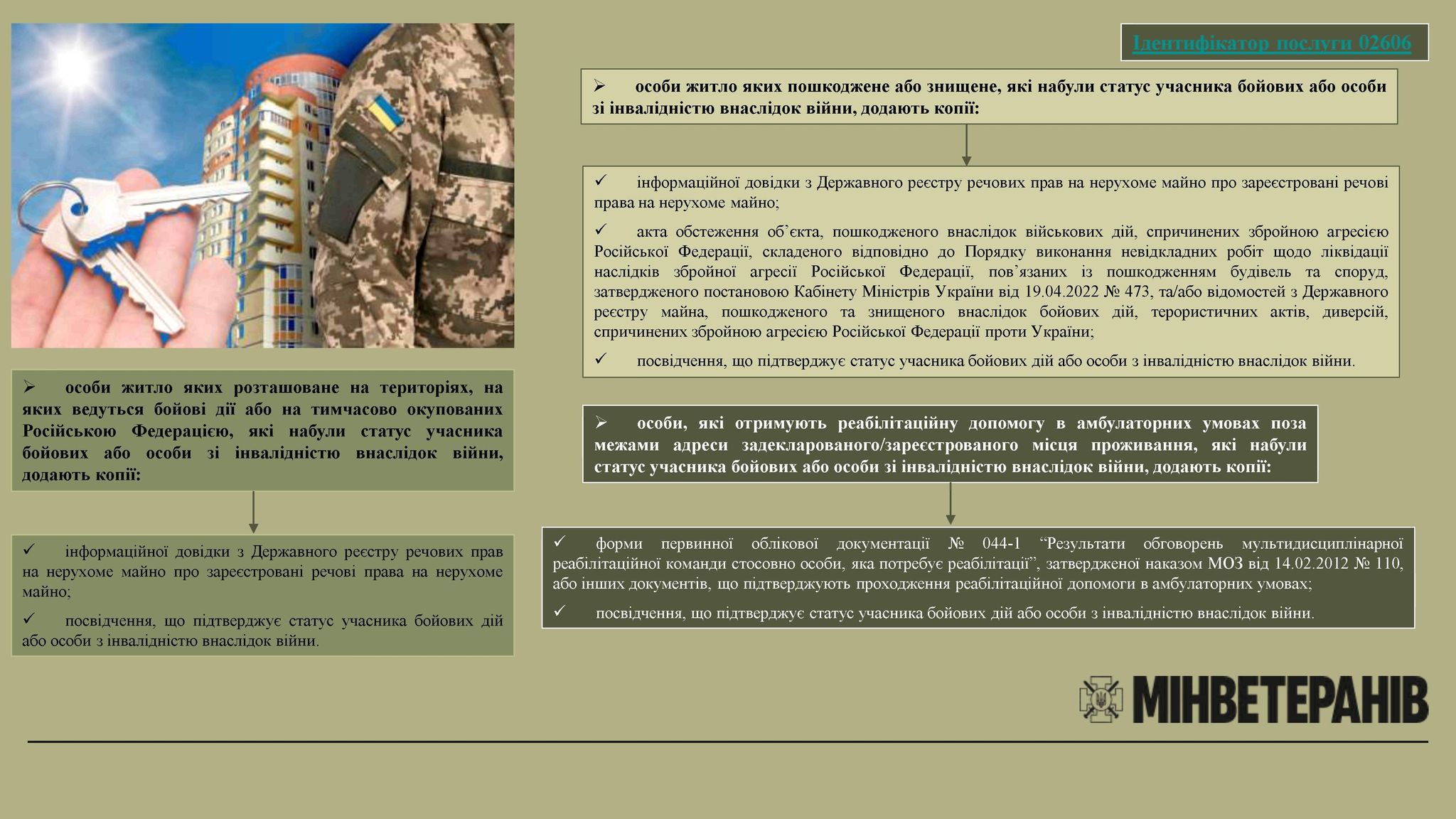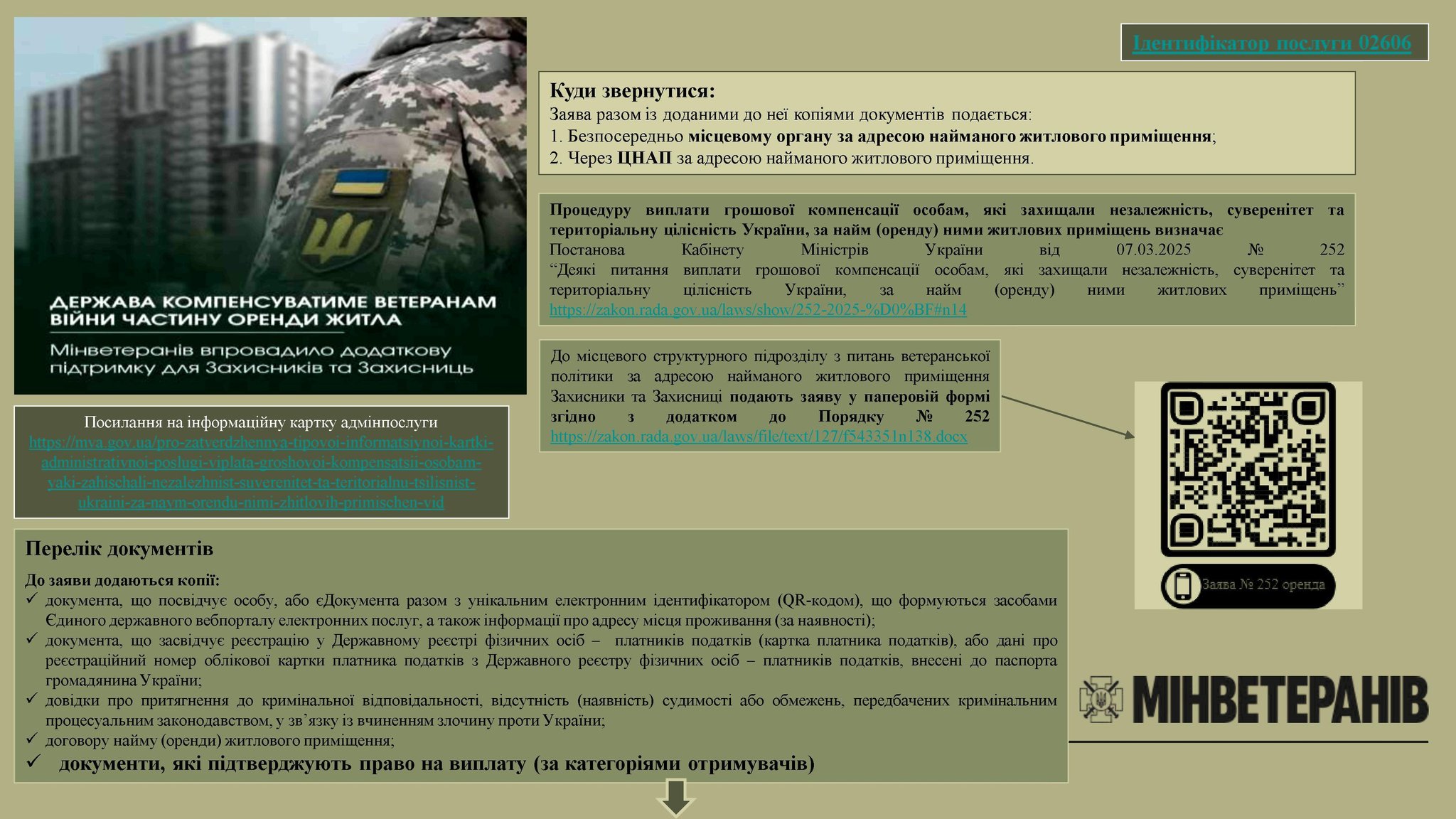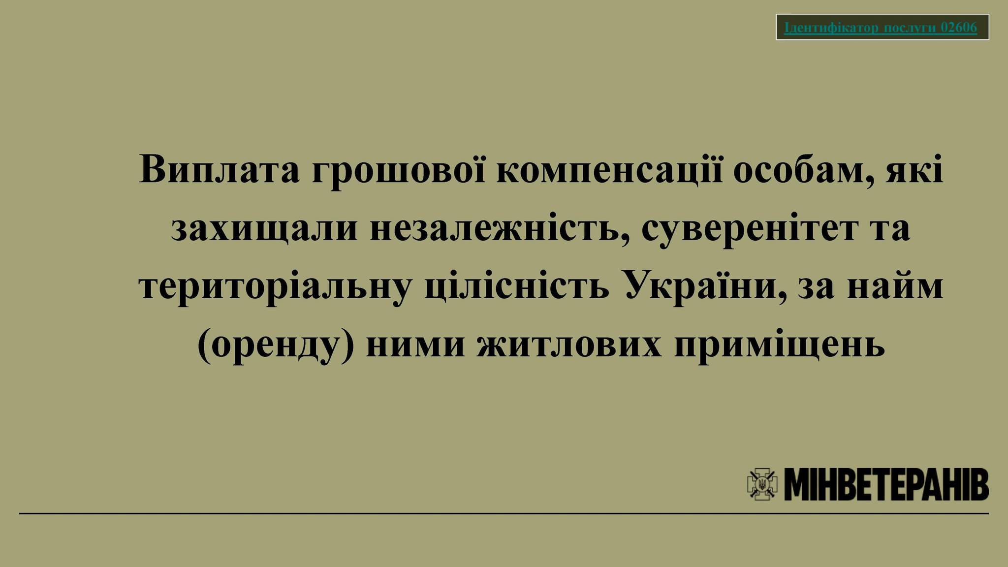 Міністерством у справах ветеранів України підготовлено інформаційно-презентаційні матеріали щодо нової адміністративної послуги 02606 “Виплата грошової компенсації особам, які захищали незалежність, суверенітет та територіальну цілісність України, за найм (оренду) ними житлових приміщень”.