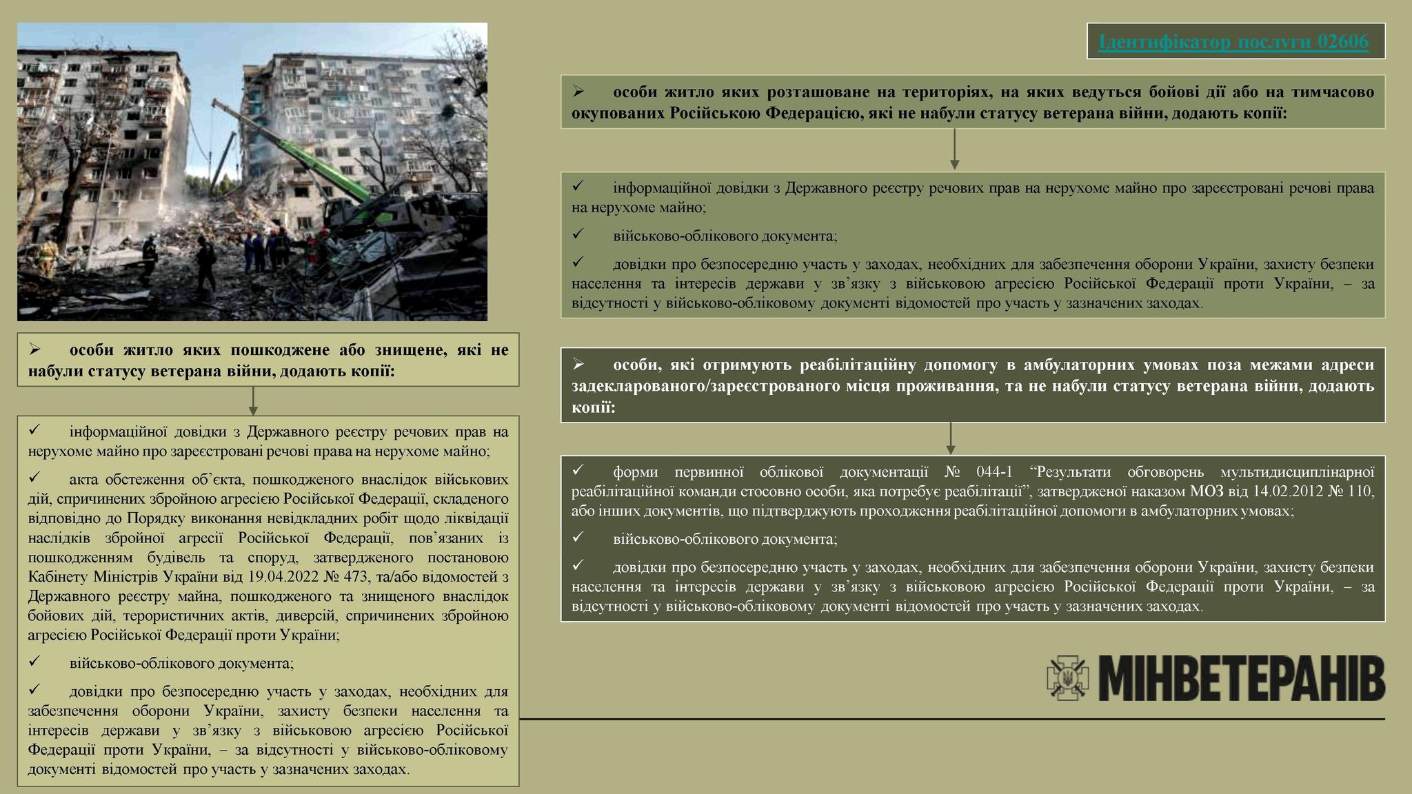 Міністерство у справах ветеранів України активно працює над забезпеченням належної підтримки для наших захисників, які відстоювали незалежність, суверенітет та територіальну цілісність країни. В рамках цих зусиль були підготовлені важливі інформаційно-презентаційні матеріали щодо нової адміністративної послуги 02606. Ця послуга, що отримала назву “Виплата грошової компенсації особам, які захищали незалежність, суверенітет та територіальну цілісність України, за найм (оренду) ними житлових приміщень”, є значним кроком у напрямку соціальної підтримки ветеранів. Це конкретна допомога, яка безпосередньо стосується вирішення житлових питань для тих, хто пройшов крізь випробування війни.