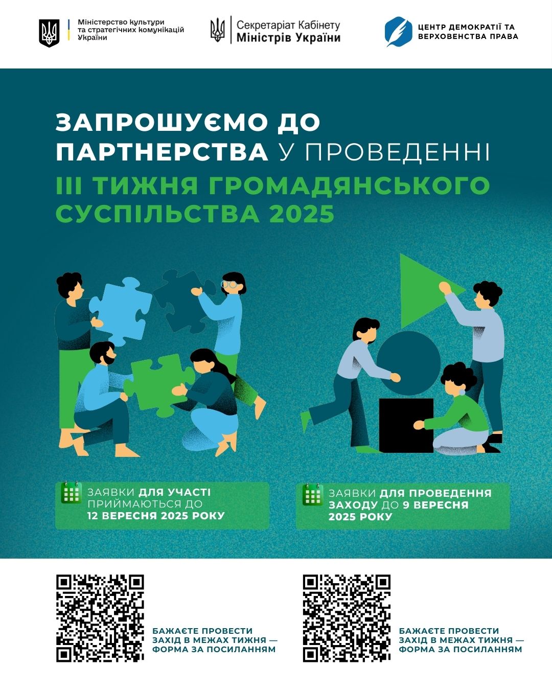 📌 Для організаторів подій: Якщо ваша організація планує провести захід у рамках ІІІ Тижня громадянського суспільства, просимо заповнити спеціальну форму за посиланням: Форма для організаторів. Зверніть увагу, що відповіді приймаються до 09 вересня 2025 року. Це чудова нагода представити свою діяльність та знайти нових партнерів.