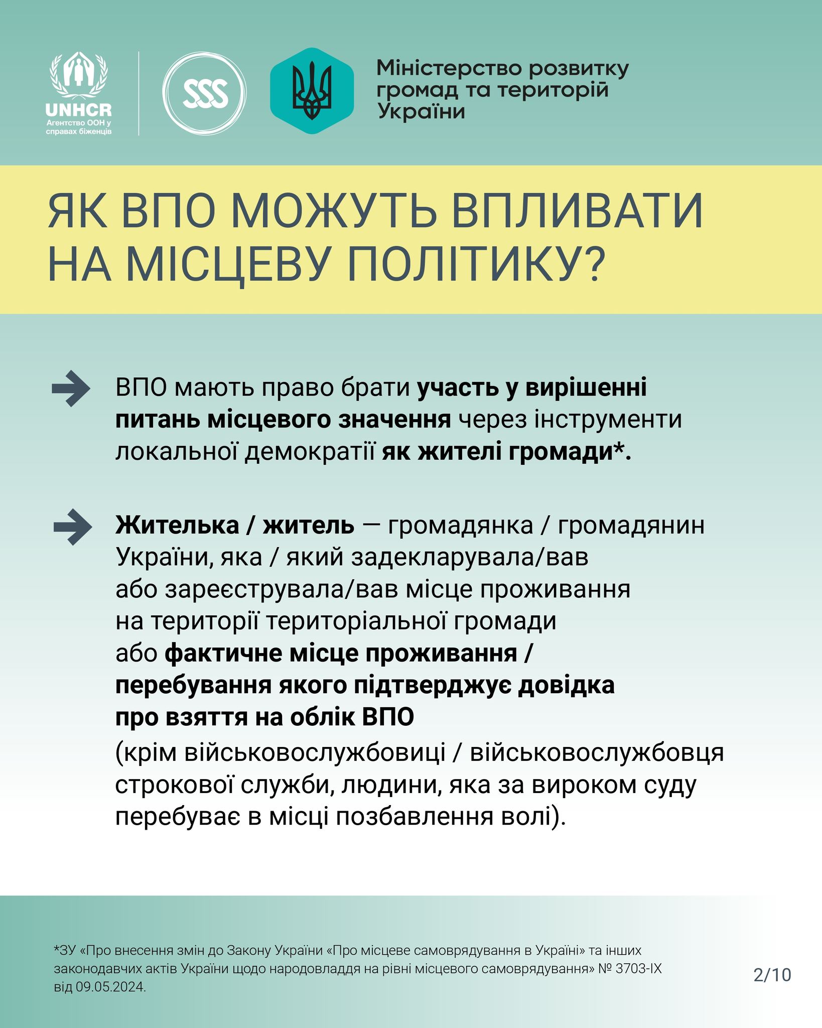 Пам’ятайте, що ви є повноправними членами громади, і ваш голос, ваші думки та пропозиції мають величезне значення для розвитку спільного простору. Активна участь ВПО у громадських процесах сприяє збагаченню громади новими ідеями та перспективами, роблячи її більш стійкою та різноманітною.