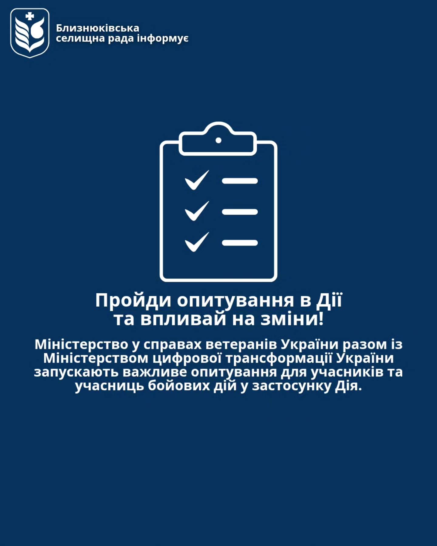 Міністерство у справах ветеранів України спільно з Міністерством цифрової трансформації України ініціювали важливе опитування в Дії, спеціально розроблене для учасників та учасниць бойових дій. Ваша думка є надзвичайно важливою для нас! Лише кілька кліків у застосунку Дія допоможуть нам у формуванні нових, зручних сервісів та визначенні переліку найбільш необхідних послуг для ветеранів та ветеранок.