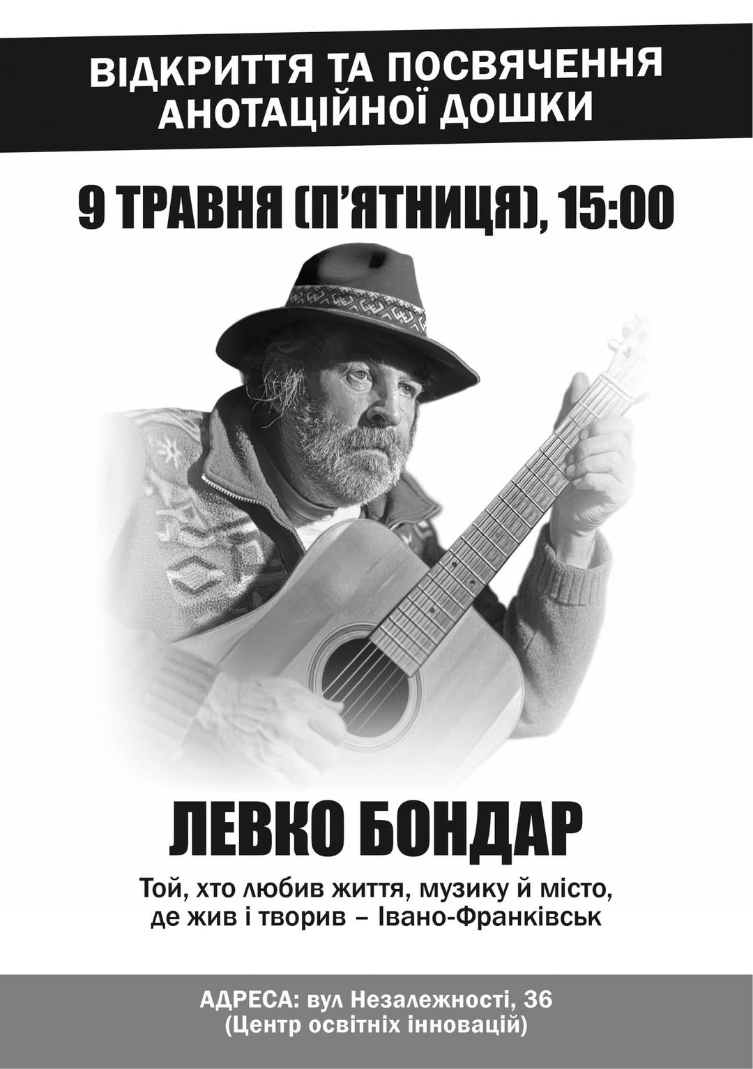 Левко Бондар (15 лютого 1956 – 26 березня 2022) – видатний український музикант, бард, виконавець, композитор та автор текстів, засновник гурту “Бункер Йо”. Він був патріотом Івано-Франківська, де його пісні звучали на центральних площах, даруючи радість та натхнення мешканцям міста. Левко Бондар – це частина історії Івано-Франківська, його музика живе у серцях франківців.