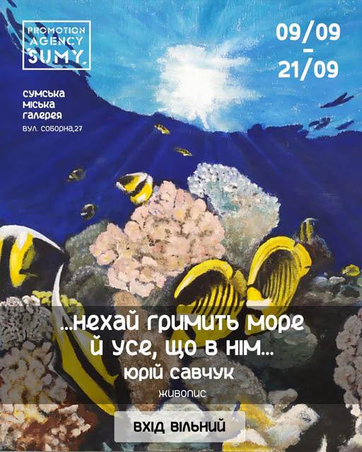 Міська галерея запрошує поціновувачів мистецтва на дві захопливі виставки, що відкриють нові грані творчості. Першою експозицією стане живопис Юрія Савчука «…Нехай гримить море й усе, що в нім…». Художник із захопленням досліджував дивовижний підводний світ коралових рифів, використовуючи снорклінг, дайвінг та фрідайвінг як інструменти для глибшого пізнання цього прекрасного середовища. Чим більше він занурювався у морські глибини, тим сильнішою ставала потреба поділитися враженнями від побаченої краси.