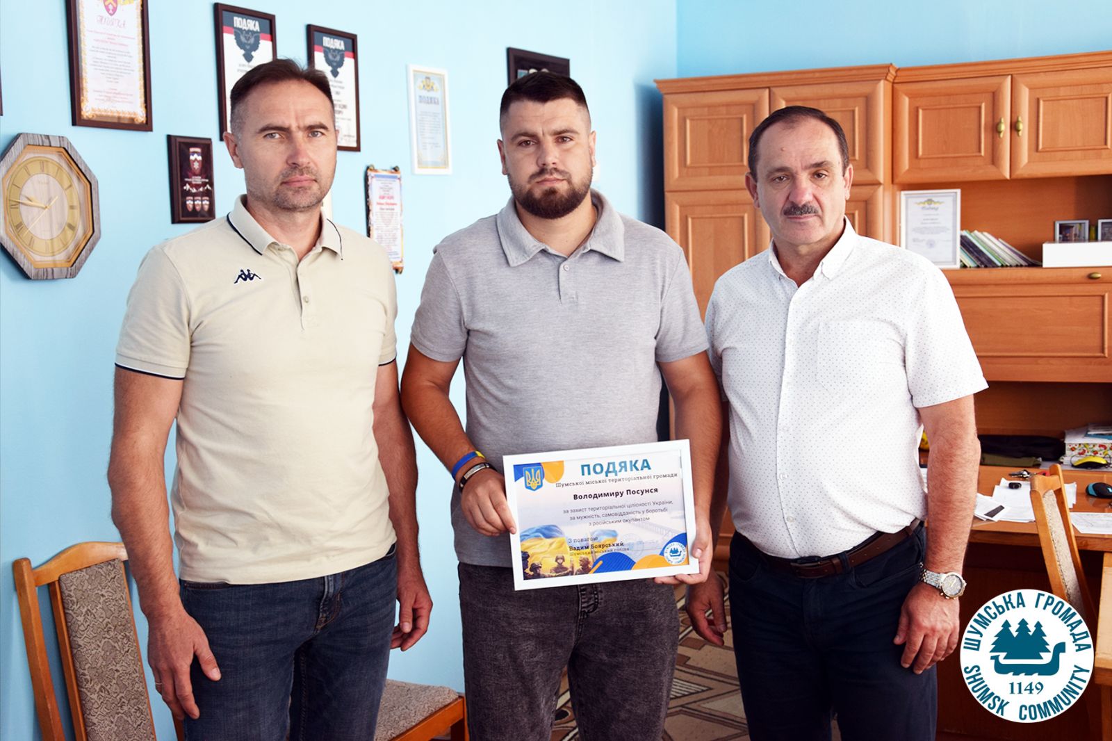 Міський голова Вадим Боярський спільно зі старостою Олександр Михальчук зустрілися з військовослужбовцем Володимиром Посунся. Від імені жителів Шумської громади вони висловили йому вдячність за мужність, патріотизм та самовідданий захист рідної землі.