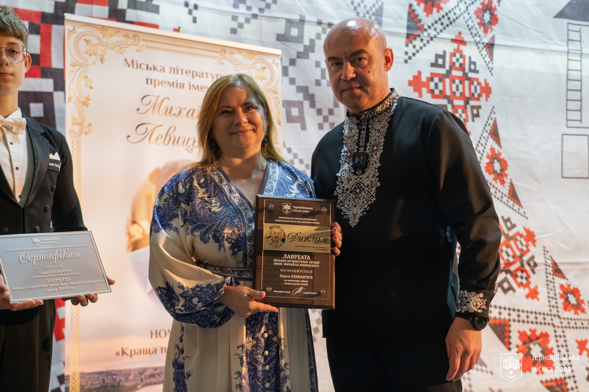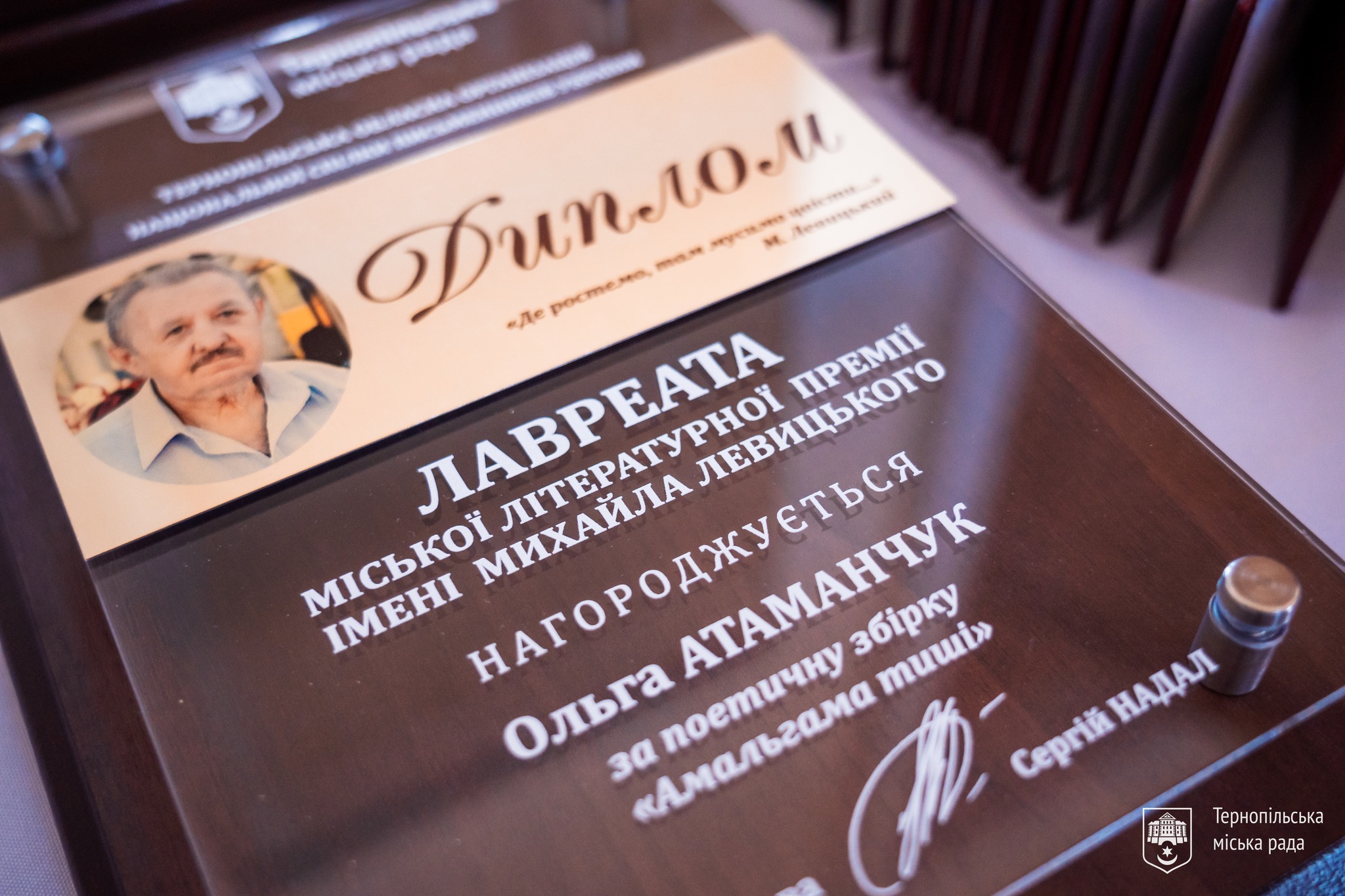 У Тернополі відбулося знаменне свято – міський голова Сергій Надал вручив престижну міську літературну премію імені Михайла Левицького. Цьогоріч почесну відзнаку отримала талановита поетеса Ольга Атаманчук за її високо оцінену збірку «Амальгама тиші». Ця нагорода є щорічною і присуджується одному переможцю в номінації «Краща поетична збірка», відзначаючи видатні досягнення у сфері поезії. Премія імені Михайла Левицького, заснована у 2024 році, покликана вшанувати пам’ять видатного поета, художника, перекладача та громадського діяча. Її створення має на меті стимулювати та підтримувати літературний процес на Тернопільщині, сприяючи розвитку творчої думки та збагаченню культурного простору регіону. Урочиста церемонія вручення відбулася в рамках святкування Дня міста Тернополя, додавши події особливого значення та підкресливши важливість літератури для громади. Ми щиро вітаємо Ольгу Атаманчук з цим заслуженим визнанням. Її творчість є яскравим прикладом майстерності та глибини, що надихає інших. Бажаємо Ользі нових творчих злетів, невичерпного натхнення та подальших успіхів у її літературній діяльності, яка збагачує культурне життя Тернополя та України.