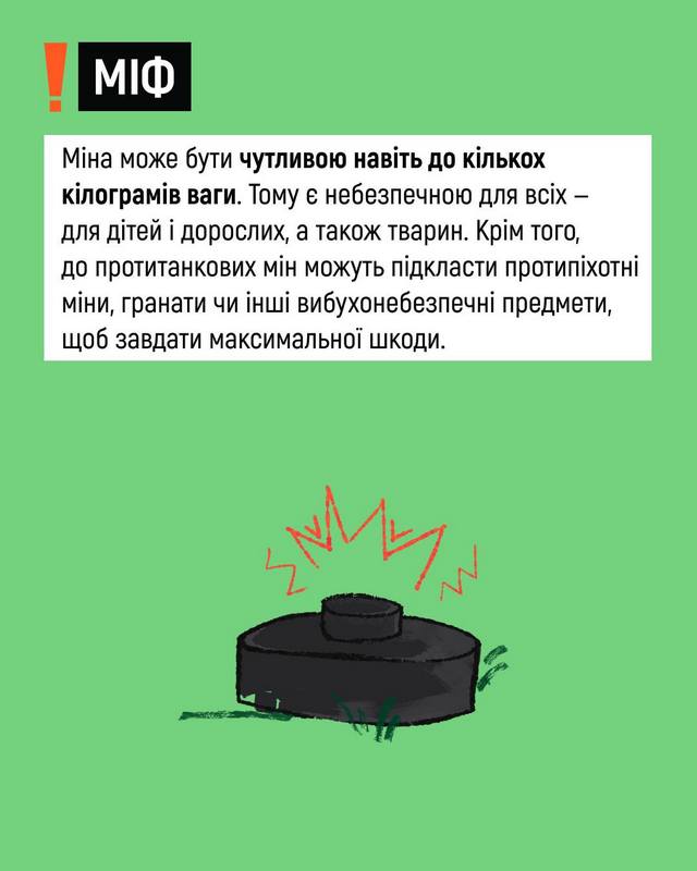 Освітні кампанії та інформаційні матеріали відіграють ключову роль у формуванні безпечної поведінки. Важливо, щоб інформація про вибухонебезпечні предмети була доступною та зрозумілою для широкої аудиторії, включаючи дітей та дорослих. Перевірені знання – це той інструмент, який може врятувати життя. Гортайте картки з інформацією про безпечну поведінку разом з дітьми, щоб розвіяти поширені міфи та уберегти їх від біди. Наприклад, існує міф, що вибухонебезпечні предмети не вибухають, якщо їх не чіпати. Це вкрай небезпечне припущення, адже багато таких предметів можуть детонувати від найменшого руху, вібрації або зміни температури. Інший поширений міф – що старі снаряди чи міни вже не становлять загрози. Це також далеко від істини, адже вони можуть зберігати свою бойову потужність десятиліттями.