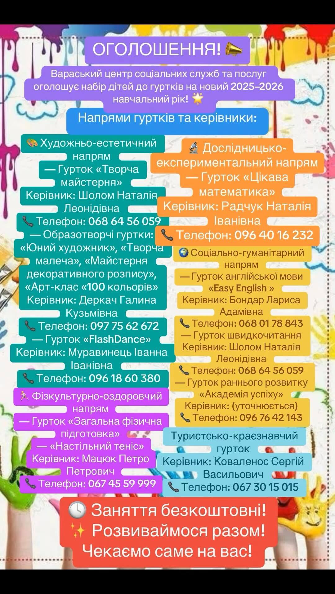 Вараський центр соціальних служб та послуг (ВЦССП) оголошує набір дітей до гуртків на 2025-2026 роки за різними напрямами.