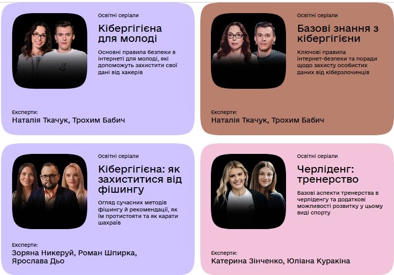 Для тих, хто прагне ще глибше зануритися в тему та впевнено користуватися сучасними гаджетами і цифровими послугами, не боячись стати жертвою фішингових атак чи інших кіберзагроз, портал пропонує низку спеціалізованих онлайн-курсів. Ці курси охоплюють широкий спектр тем, від базових знань до специфічних аспектів персональної кібергігієни. Серед них: «Кібергігієна для молоді», «Базові знання з кібергігієни», «Кібергігієна: як захиститися від фішингу», «Персональна кібергігієна», «Онлайн-безпека для освітян» та «Базові цифрові навички для людей елегантного віку».