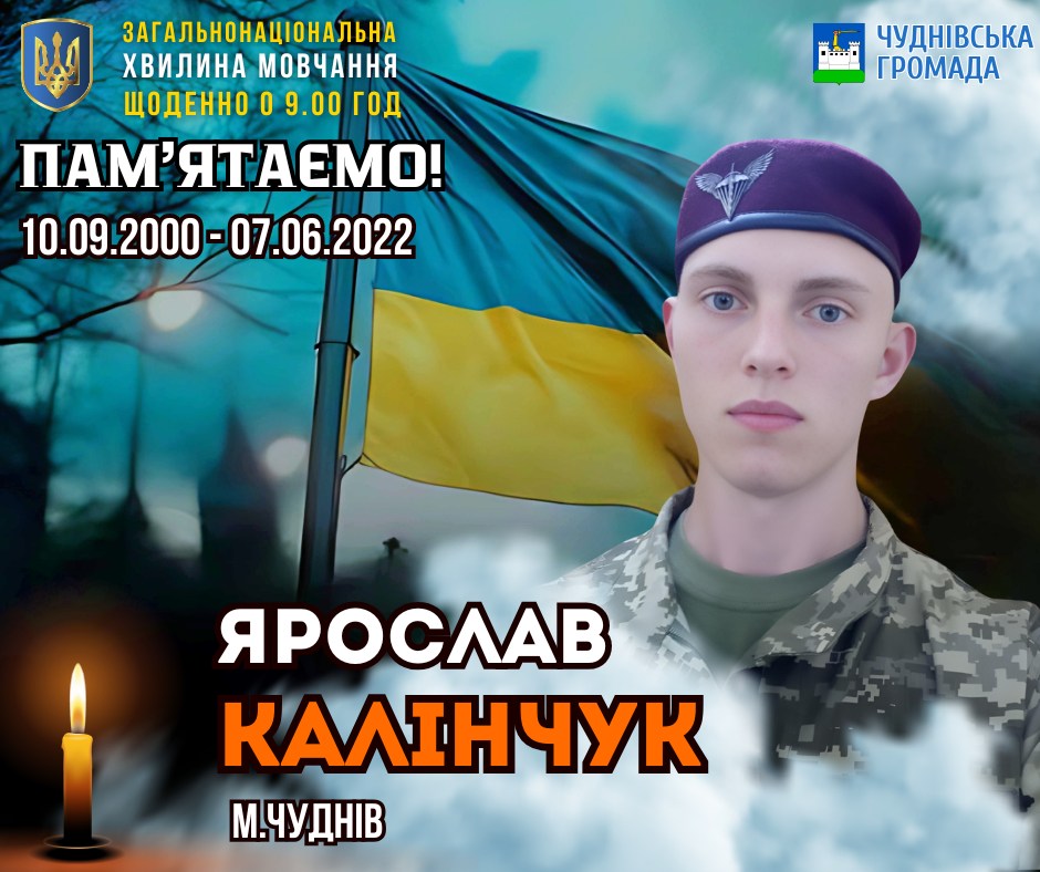 Навіки 21… 🥀 Сьогодні, 10 вересня, мав би відзначати свій земний День народження Герой України, наш земляк з Чуднівської громади – Ярослав КАЛІНЧУК. На жаль, його життя обірвалося від рук російських окупантів, які вторглися на нашу землю. Ярослав був відважним та мужнім воїном, який до останнього свого подиху боровся за свободу, за мир, за вільну Україну. Його подвиг назавжди залишиться в наших серцях. Вічний спочинок та світла пам’ять Герою! Низький уклін рідним та близьким воїна, які втратили найдорожче. Ми пам’ятаємо кожного, хто віддав життя за нашу незалежність. 🇺🇦🕯 У хвилину мовчання вшануймо світлу пам’ять Героїв Чуднівської громади, які ціною власного життя виборювали незалежність, суверенітет та територіальну цілісність України. Їхня жертва не буде марною. Ми обов’язково переможемо ворога. Слава Україні! #Чуднівська_ТГ #ХвилинаМовчання #StandWithUkraine