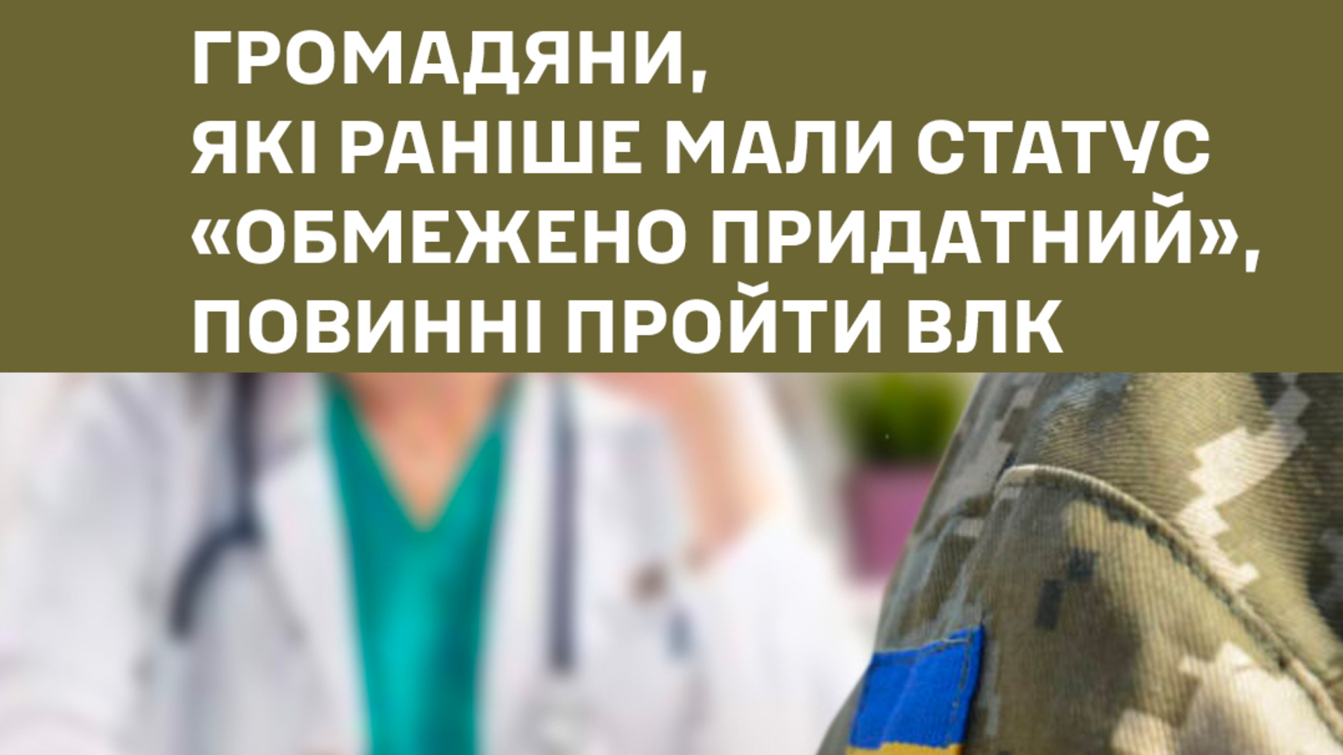 Увага! Військовозобов’язані громадяни, які до 4 травня 2024 року отримали статус обмежено придатних до військової служби, повинні повторно пройти військово-лікарську комісію (ВЛК) до 5 червня поточного року. Це важлива вимога, передбачена чинним законодавством України.