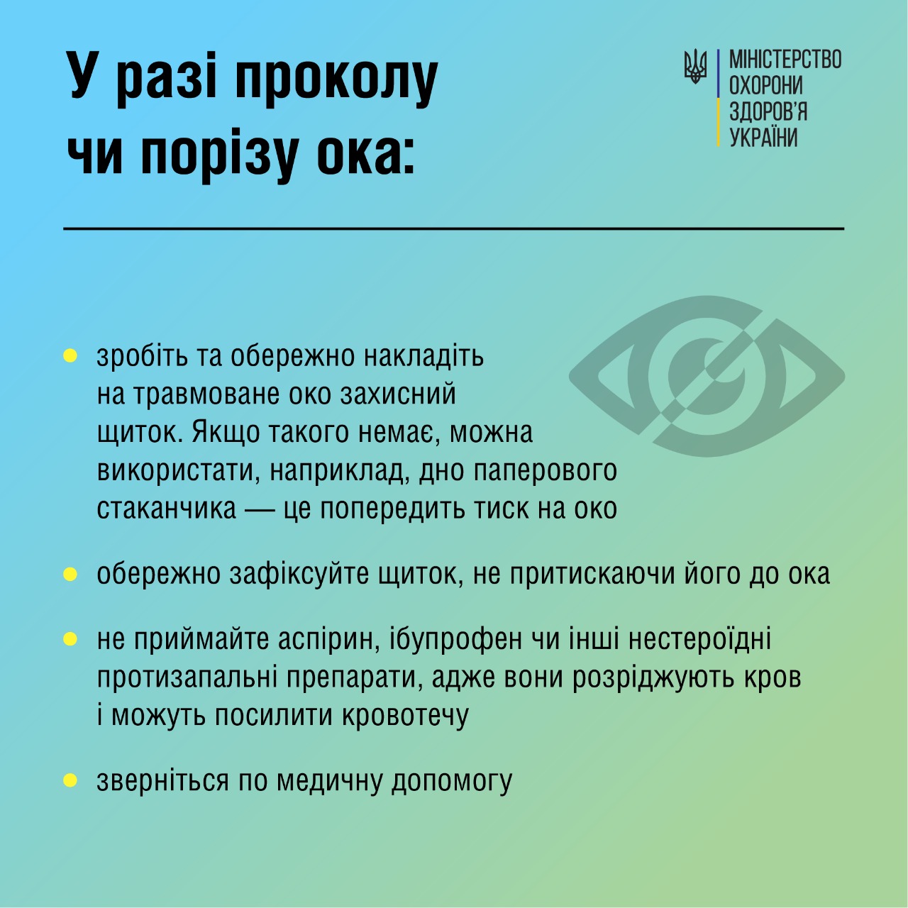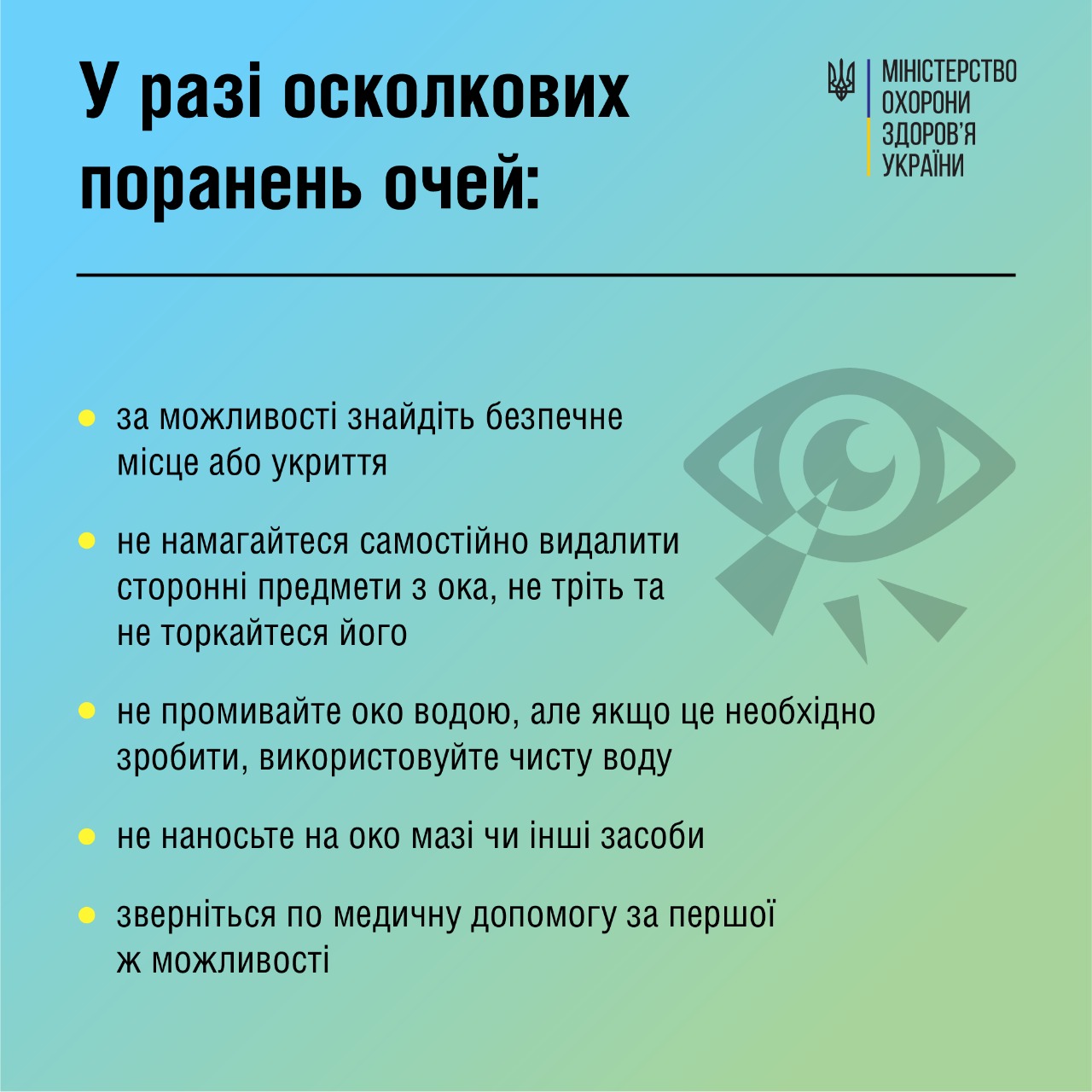 Пам’ятайте, правильно та вчасно надана домедична допомога знизить тяжкі наслідки уражень ока та збільшить шанси на порятунок зору.