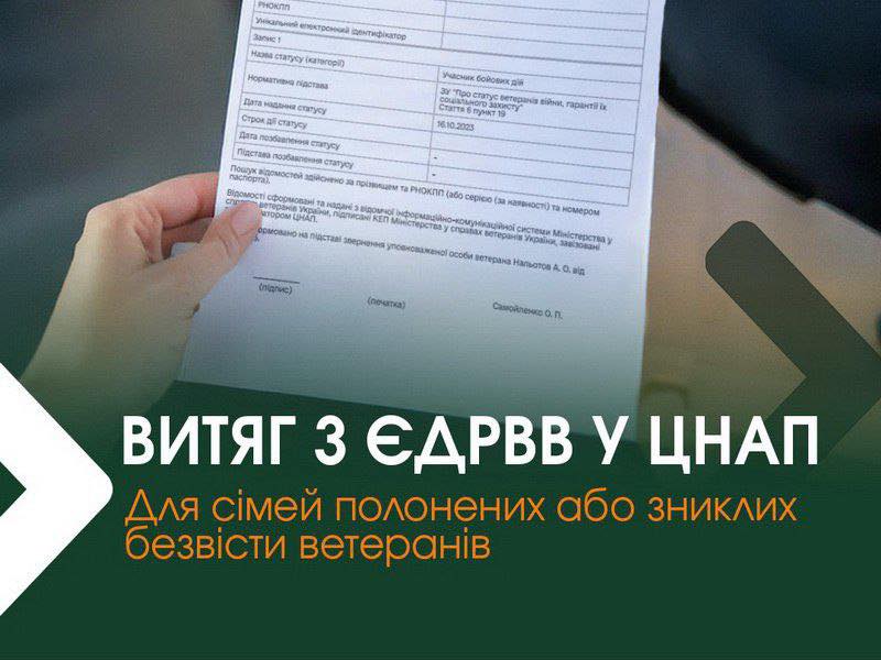 👩👨Нагадуємо, що родини полонених та зниклих безвісти ветеранів війни можуть отримати відомості з Єдиного державного реєстру ветеранів війни (ЄДРВВ).