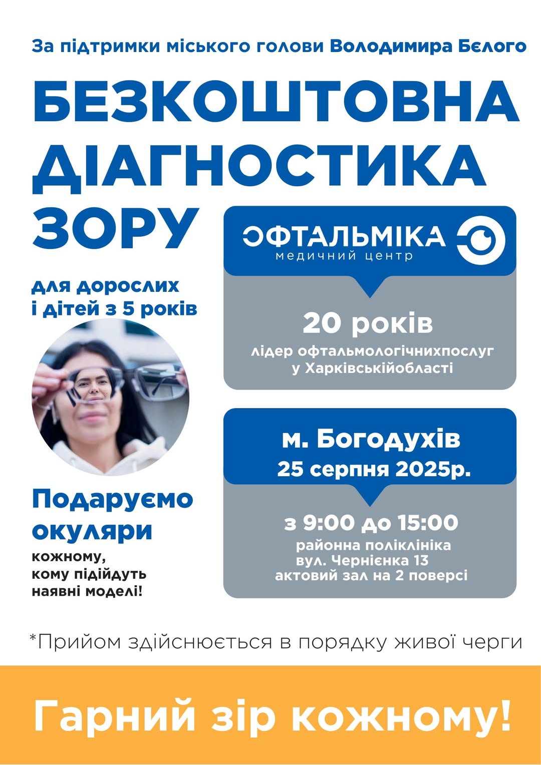 Не пропустіть унікальну можливість подбати про свій зір! Безкоштовне обстеження зору від «Офтальміки» — це крок до збереження вашого зору на довгі роки. Місце проведення: поліклініка, вул. Д. Чернієнка, 13. Час: 25 серпня 2025 року, з 09:00 до 15:00. Очікуємо всіх бажаючих!