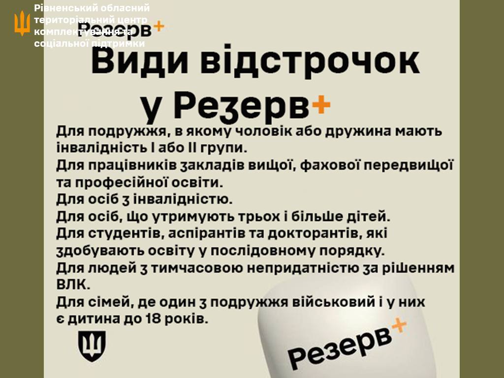 В електронному застосунку Резерв+ можливо оформити відстрочки від мобілізації наступним категоріям громадян України: