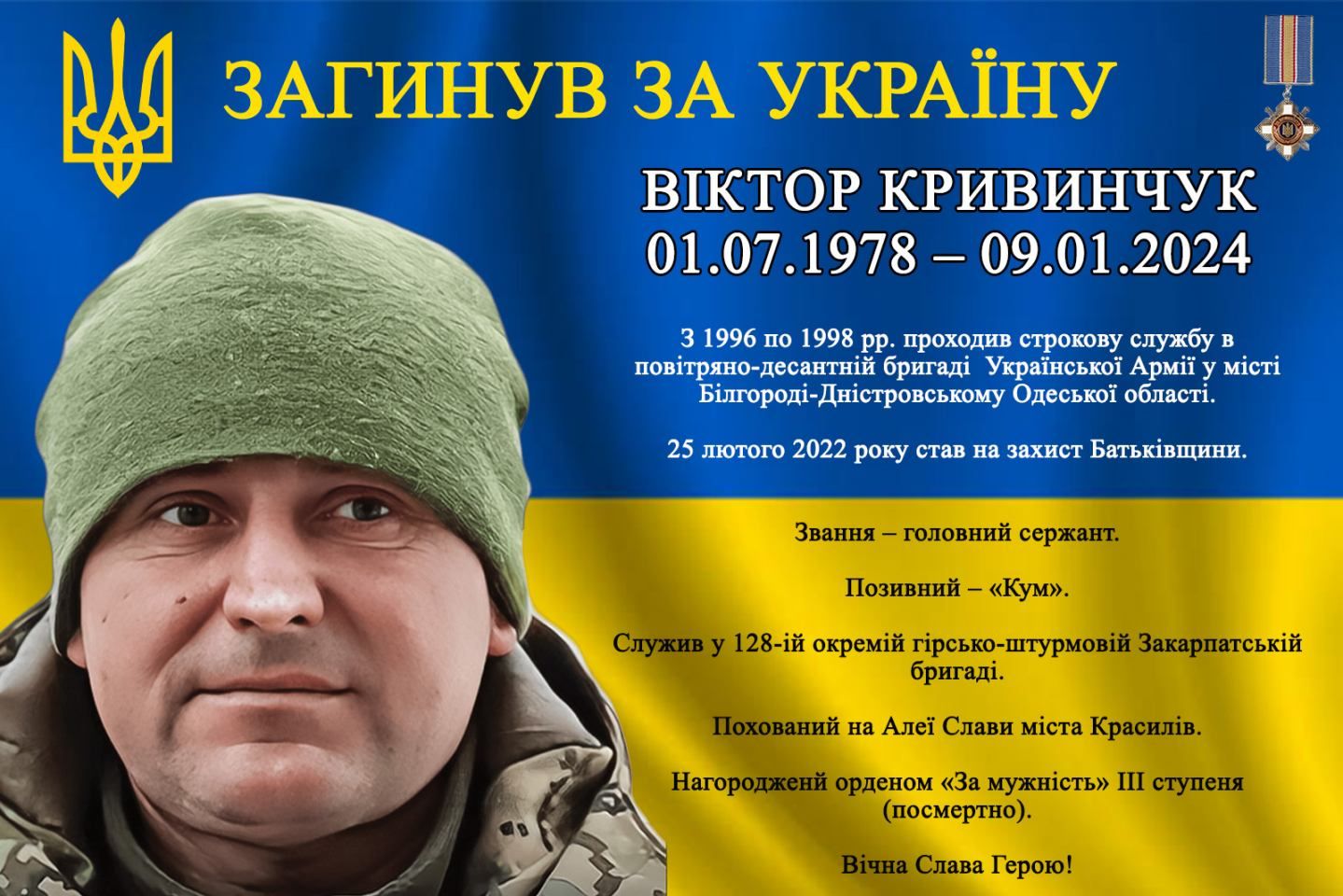 🕯 Сьогодні, 9 січня, минає друга річниця з дня загибелі мужнього Воїна, Захисника України – головного сержанта Віктора КРИВИНЧУКА.