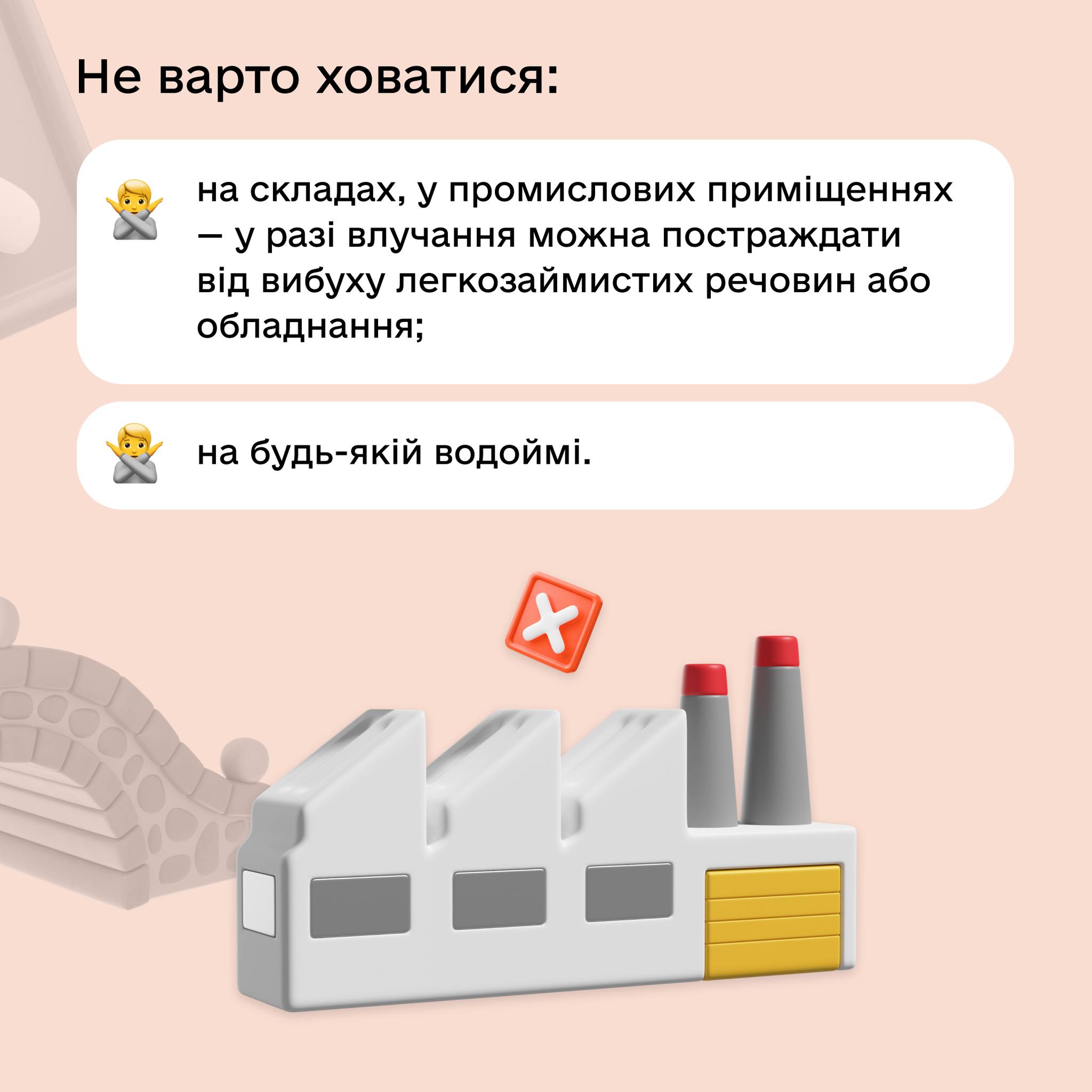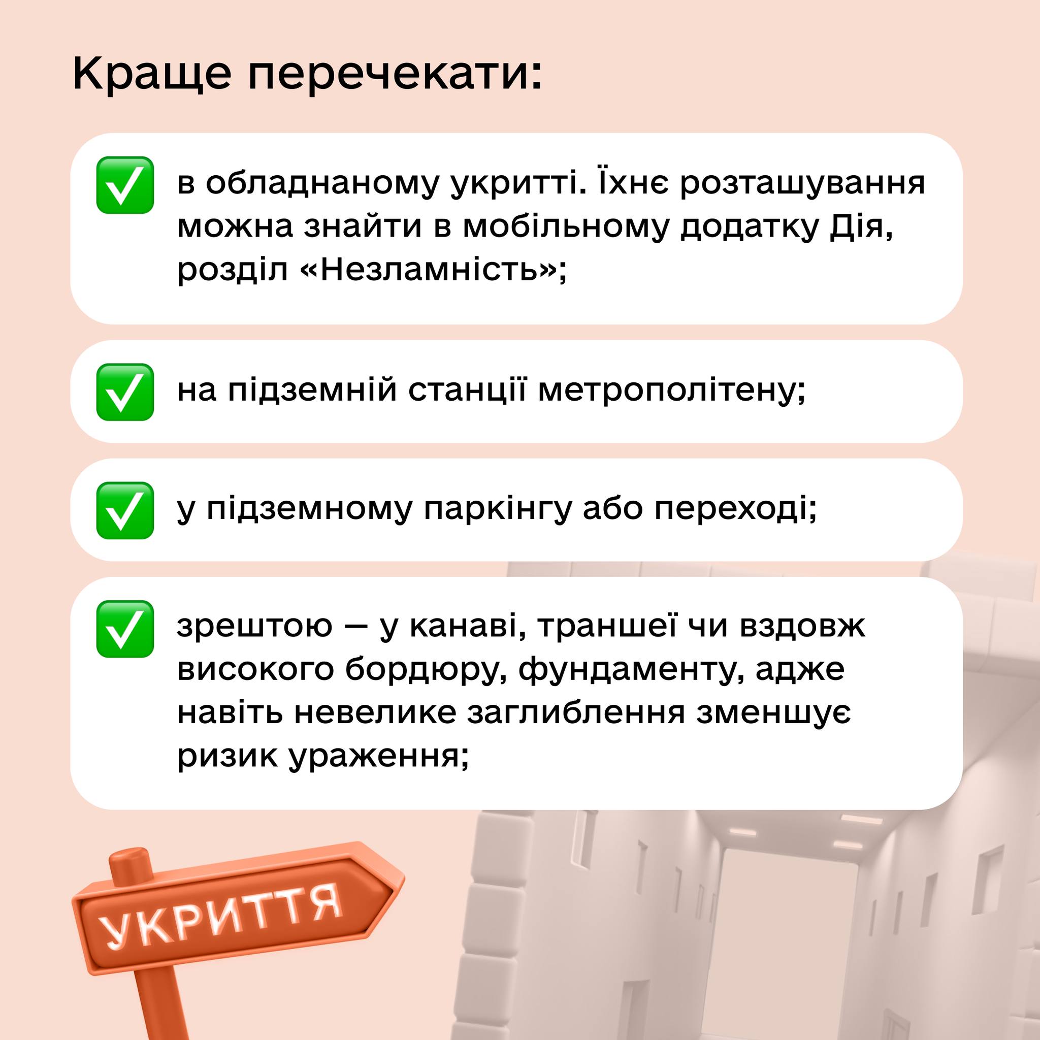 4. **Підземні переходи та тунелі:** Хоча на перший погляд вони здаються безпечними, але можуть бути заблоковані внаслідок обвалу або використовуватися ворогом для укриття.