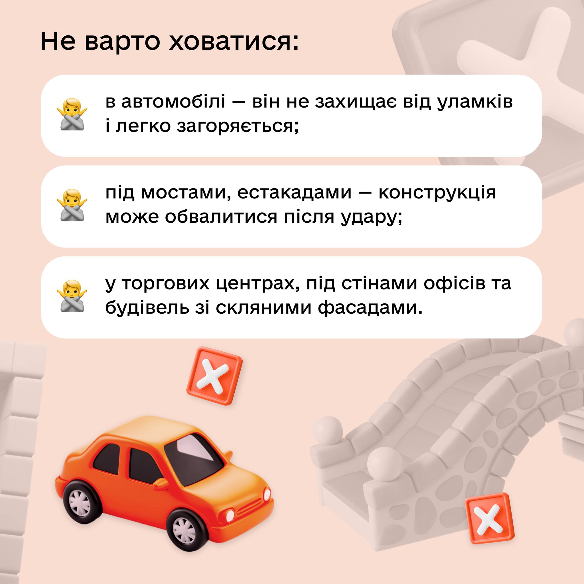 3. **Транспортні засоби:** Автомобілі, автобуси, трамваї. Вони не забезпечують надійного захисту і можуть стати пасткою.