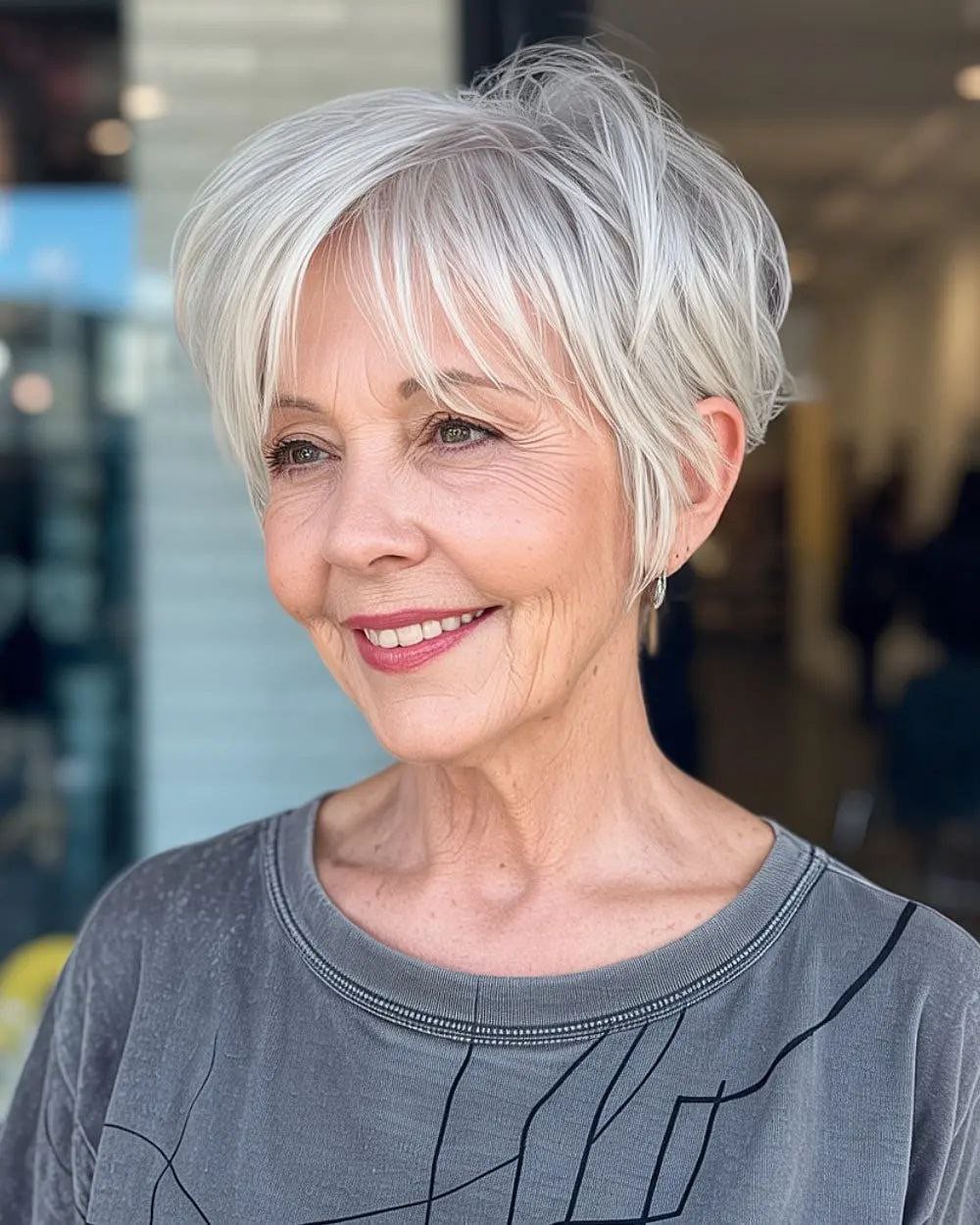 Для сивого та світлого волосся ідеально підійде фактурний чубчик із розрідженими пасмами. Він додає зачісці легкості та динамічності, візуально омолоджуючи приблизно на 10-15 років. Це чудовий спосіб освіжити образ.