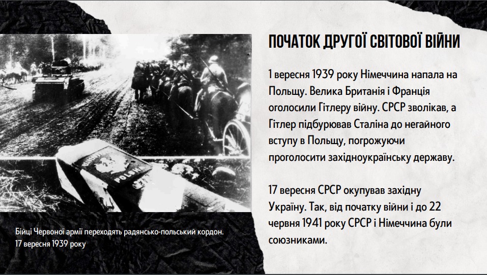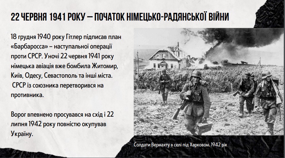 Українські землі двічі пережили жахіття війни. Тактика «спаленої землі» застосовувалася як відступаючою Червоною армією, так і армією Третього Райху. Тут відбувалися масштабні битви, розгорнувся безпрецедентний рух спротиву. Українські національні військові партизанські загони почали формуватися з 1941 року, зокрема, «Поліська Січ» під проводом Тараса Бульби-Боровця. Згодом, ініціативу та назву УПА перейняла Організація українських націоналістів ОУН(б). УПА налічувала десятки тисяч бійців, які діяли на Волині, Поліссі та Галичині, здійснюючи рейди, напади на німецькі гарнізони та склади, ведучи сутички з радянськими партизанами та військами НКВС. Після приходу радянської влади у 1944 році УПА продовжила боротьбу в підпіллі до кінця 1950-х років, демонструючи незламність духу українського народу.