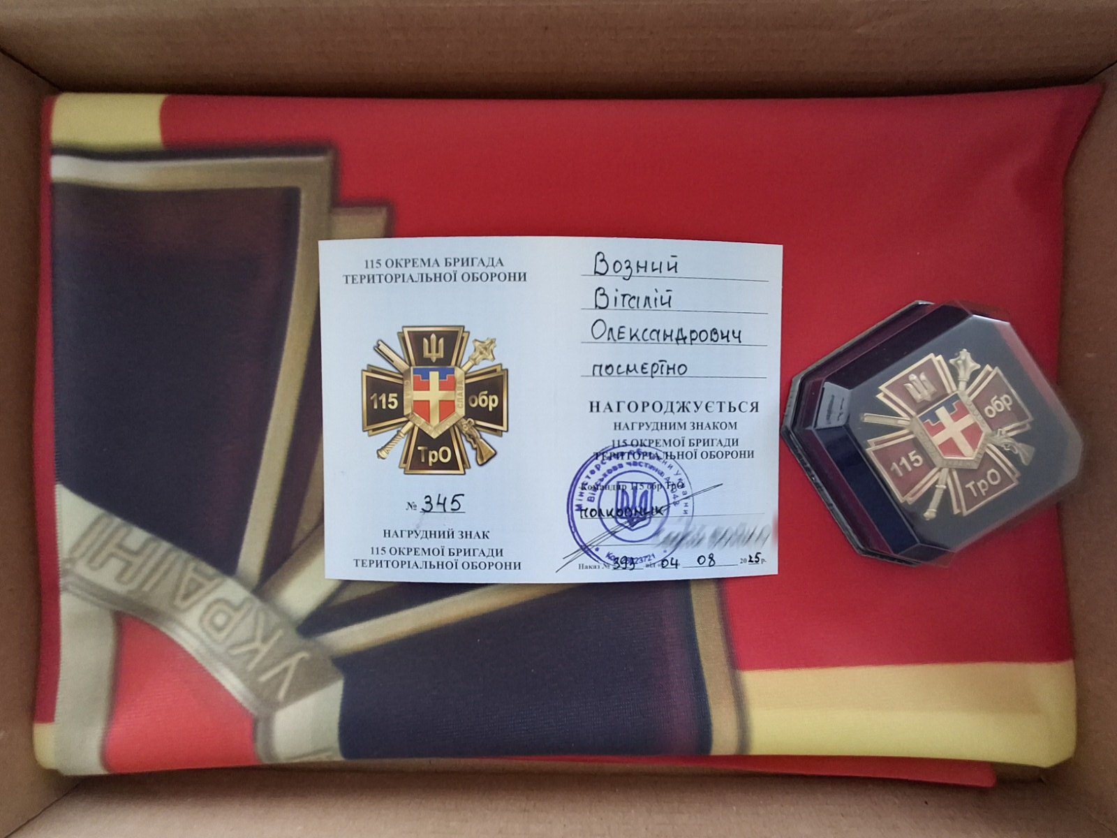 🔰Нашого полеглого земляка, військовослужбовця 115-ї окремої бригади Сил територіальної оборони України Віталія Возного, було посмертно відзначено нагородою бригади. 🇺🇦Прапор та відзнаку за заслуги сина отримала його мати — Галина Возна. 🔸️Віталій народився та виріс у Малині. З початком повномасштабного вторгнення він став на захист держави. Спершу ніс службу на білоруському кордоні, згодом був передислокований на Харківщину, де обороняв Куп’янський та Ізюмський райони. 6 січня 2025 року Віталій Возний загинув поблизу населеного пункту Першотравневе Ізюмського району Харківської області. Його життя обірвалося на 31-му році. 🔸️Наказом Міністра оборони України від 25 січня 2025 року № 107 Віталія Олександровича Возного нагороджено «Хрестом доблесті» (посмертно). 🙏Світла пам’ять Герою!