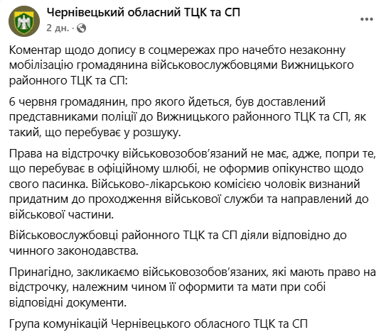 У Чернівецькому обласному ТЦК підтвердили, що громадянин був доставлений представниками поліції до Вижницького районного ТЦК, оскільки перебував у розшуку. Цей інцидент став ще одним епізодом в обговоренні мобілізації в Україні.