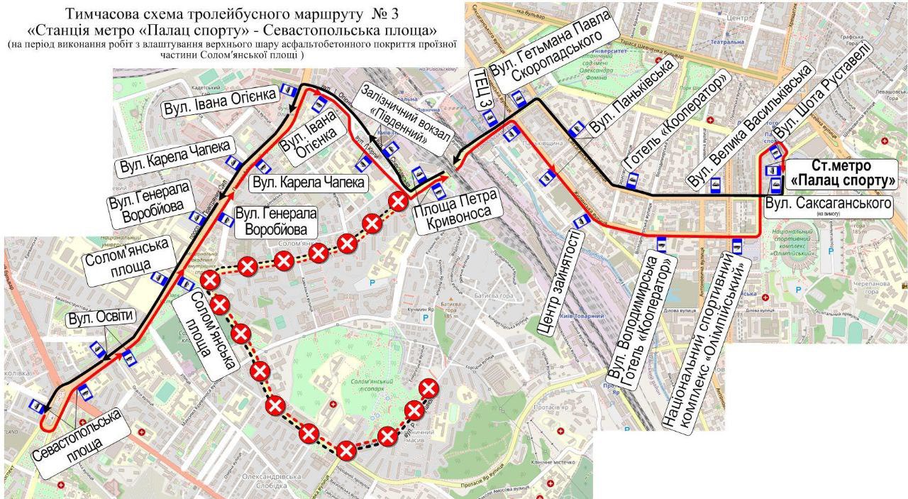 🔹 Тролейбус № 3: Транспорт курсуватиме від станції метро «Палац спорту» до вулиці Липківського за встановленим маршрутом. Далі, маршрут продовжуватиметься вулицею Січеславською, вулицею Огієнка, проспектом Повітряних Сил до Севастопольської площі.