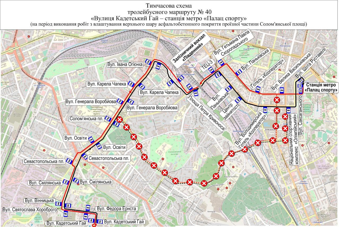 🔹 Тролейбус № 40: Маршрут розпочинатиметься від вулиці Кадетський Гай до Солом’янської площі за своїм звичним шляхом. Подальший рух передбачає проспект Повітряних Сил, вулицю Огієнка, вулицю Кірпи, вулицю Січеславську, вулицю Липківського, вулицю Скоропадського, вулицю Жилянську, вулицю Шота Руставелі. Звідти тролейбус повертатиметься до станції метро «Палац спорту», слідуючи за маршрутом тролейбусів № 9-К.