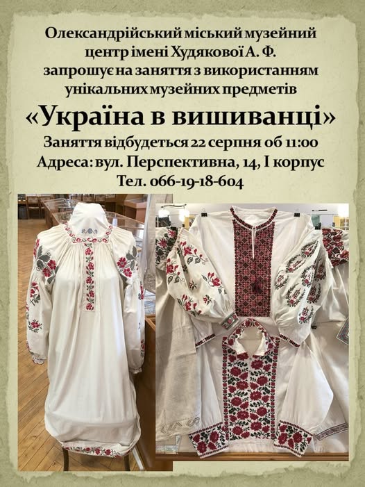 Під час заняття ви матимете нагоду на власні очі побачити справжні музейні експонати – старовинні вишиванки, вік яких сягає від 100 до 150 років. Кожна з цих вишиванок є неповторним витвором мистецтва, що несе в собі частинку історії та автентичну вишивку, характерну саме для Олександрійщини. Це чудова можливість не лише побачити, але й дізнатися про значення орнаментів, техніки вишивки та історію створення цих скарбів.