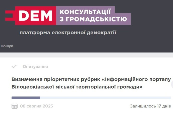 ❓На платформі «E-DEM: Консультації з громадськістю» розпочато опитування на тему: «Які рубрики хотіли б бачити мешканці на «Інформаційному порталі Білоцерківської міської територіальної громади», якби таку платформу було впроваджено вже сьогодні».