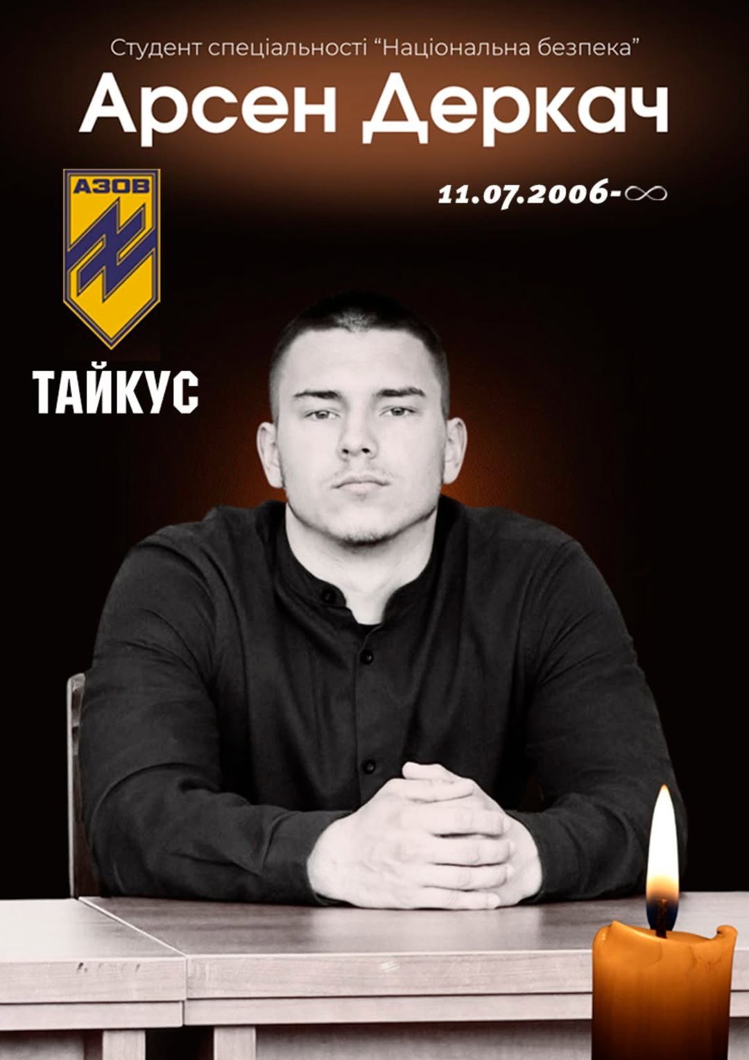 На полях битв за вільну Україну трагічно обірвалося життя юного захисника Арсена Деркача з Сопова, 2006 року народження, відомого за позивним “Тайкус”. Його відхід став болючим нагадуванням про високу ціну, яку платить наша країна за свою незалежність. Арсен мав лише 18 років, коли він віддав своє життя, проте його відвага та самовідданість були гідні найвищої похвали. Світла пам’ять про нього назавжди залишиться в серцях українців. Арсен Деркач є символом молодого покоління, яке, попри свій вік, без вагань стало на захист Батьківщини, показуючи приклад незламної волі. Життя цього молодого воїна, сповнене потенціалу, обірвалося занадто рано, але його подвиг житиме вічно.Арсен був студентом, який свідомо обрав шлях служіння державі, навчаючись в Острозькій академії за спеціальністю «Національна безпека». Попри свій зовсім юний вік, він не вагаючись став до лав 12-ї бригади спеціального призначення “Азов“, демонструючи незламну мужність та відданість своїй Батьківщині. Він героїчно тримав оборону на сході країни, у найгарячіших точках, де вирішується доля України, борючись проти ворога. Його рішення приєднатися до лав Збройних Сил України, незважаючи на можливість продовжити навчання та будувати мирне життя, підкреслює його виняткову мужність та глибоке розуміння відповідальності за майбутнє своєї країни. Арсен свідомо обрав шлях воїна, відмовившись від спокійного студентського життя заради захисту рідної землі.Життя цього відважного воїна обірвалося в районі Щербинівки, що на Бахмутщині. Тривалий час Арсен вважався зниклим безвісти, і цей короткий період невідомості наповнив серця рідних та близьких невимовною надією. Усі вірили, що він живий, що обов’язково повернеться додому. Проте ця надія, на жаль, розбилася об страшну й нещадну реальність – Арсен загинув. Він до останнього подиху залишався вірним присязі та своїм ідеалам, поповнивши списки полеглих героїв. Ця втрата стала черговим свідченням жорстокості конфлікту та неминучих жертв, які несе український народ у боротьбі за свою свободу.Цьогоріч, 11 липня, Арсену мало б виповнитися всього лише дев’ятнадцять. У цьому віці молоді люди зазвичай мріють про майбутнє, закохуються, здобувають освіту, будують плани. Але захисник Арсен Деркач обрав інший шлях – шлях воїна. Він тримав у руках зброю, захищаючи кожного з нас, невтомно вірив у Перемогу, віддавав себе повністю боротьбі і, зрештою, віддав найцінніше – своє життя. Його самопожертва є символом незламності духу українського народу перед лицем жорстокої війни в Україні. Його вчинок увійде в історію як приклад непересічної мужності та жертовності. Кожен день, проведений ним на фронті, був кроком до перемоги, і його внесок у цю боротьбу є безцінним.Неможливо знайти слова, які могли б втішити тих, хто втратив сина, брата, друга, справжнього Героя України. Неможливо змиритися з тим, що найкраща молодь нашої країни змушена дорослішати і вмирати у вогні неоголошеної війни, захищаючи право на життя майбутніх поколінь. Ці невідворотні втрати ЗСУ залишають глибокі рани в серці кожного українця, нагадуючи про ціну свободи. Кожен загиблий воїн – це незагойна рана для нашої нації. Ми зобов’язані пам’ятати ці жертви і продовжувати боротьбу, за яку вони віддали найцінніше.Ми у вічному боргу перед його подвигом, перед його роди