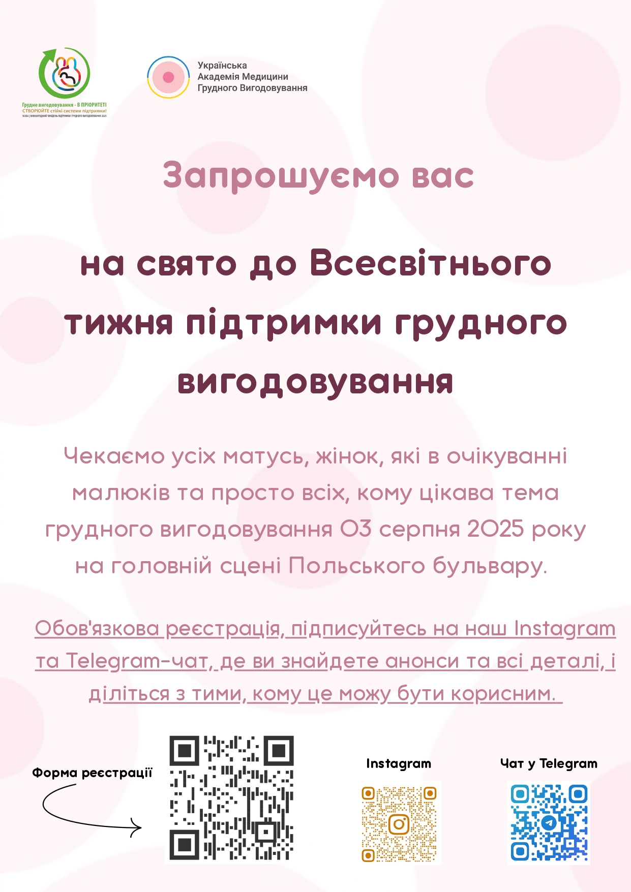 На початку серпня світ відзначає Всесвітній тиждень підтримки грудного вигодовування. З цієї нагоди громадська організація «Українська академія медицини грудного вигодовування» запрошує всіх охочих на важливу подію – живу зустріч, присвячену ключовим питанням грудного вигодовування. Ця ініціатива створена для підтримки молодих мам, вагітних жінок та всіх, хто цікавиться цією надзвичайно важливою темою для здоров’я новонароджених та благополуччя родини.