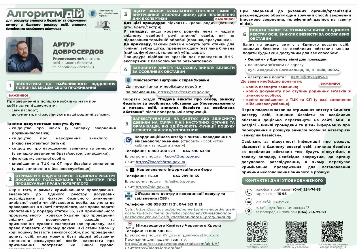На прохання органів місцевого самоврядування та родин безвісти зниклих за особливих обставин, надаємо детальну Дорожню карту дій для родин осіб, зниклих безвісти за особливих обставин, а також важливу інформацію для визволених з полону.